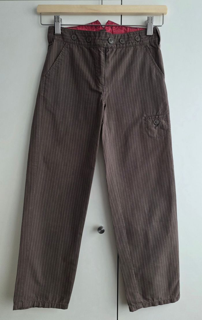 Pantalon de marque Okaidi, taille 8 ans, 70% coton, 30% polyamide. Rayé marron / beige, 3 poches avant dont 1 petite poche sur cuisse gauche, 2 poches arrière. Passant pour ceinture, taille ajustable, 1 bouton de rechange.