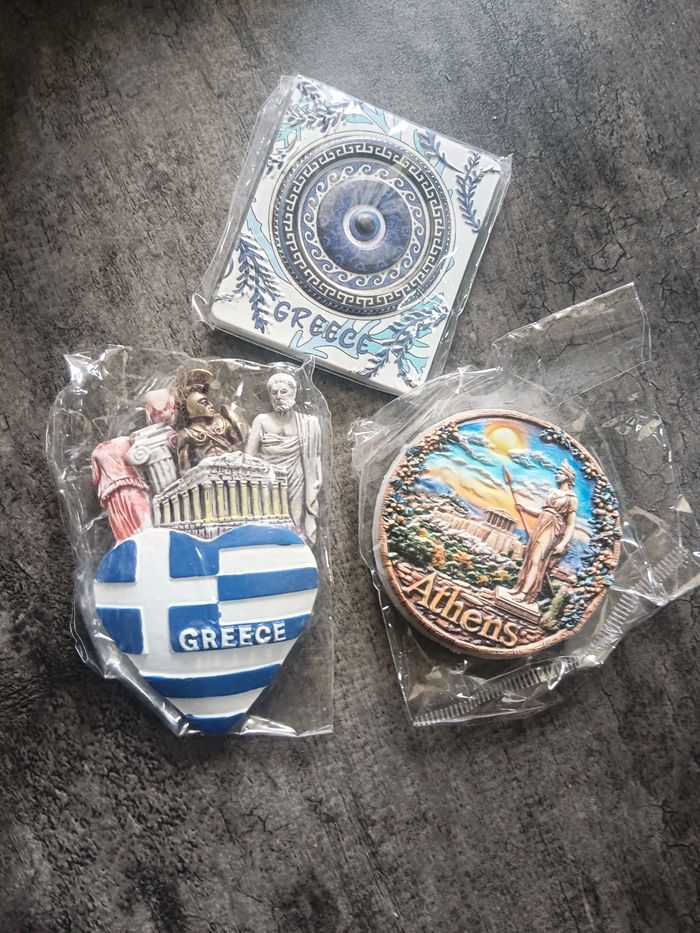 3 magnets 2 de la Grèce et 1 d Athèns Il y a celui avec les personnages il y a une petite tête cassé voir photo sinon il son nikel assez grand
