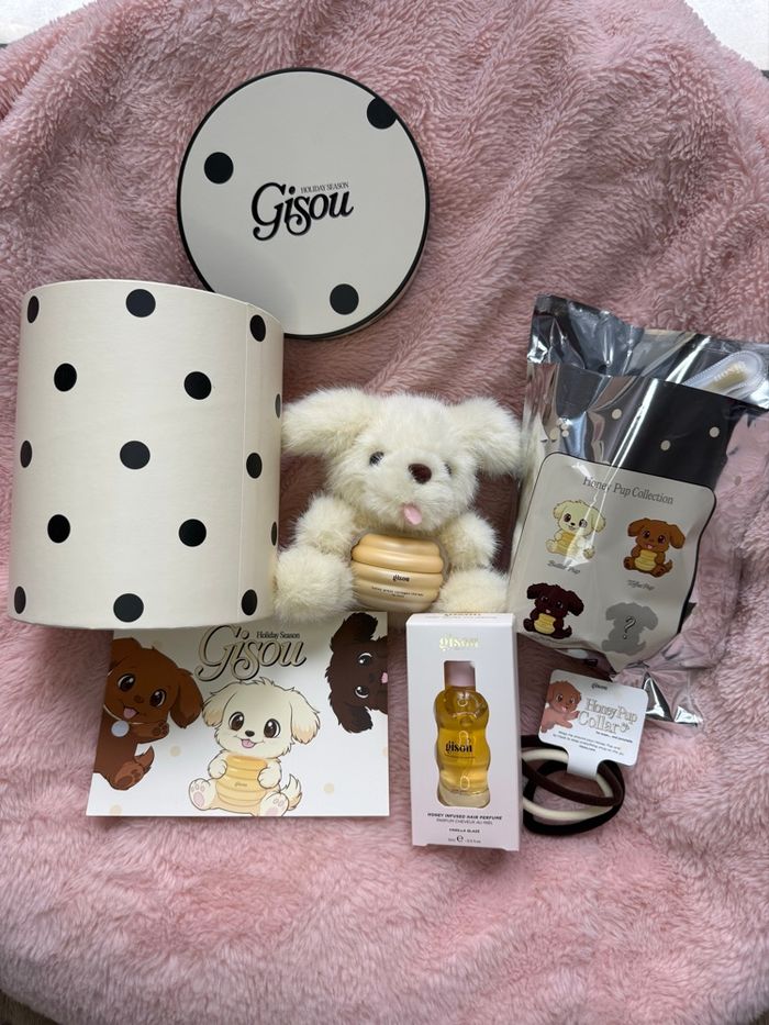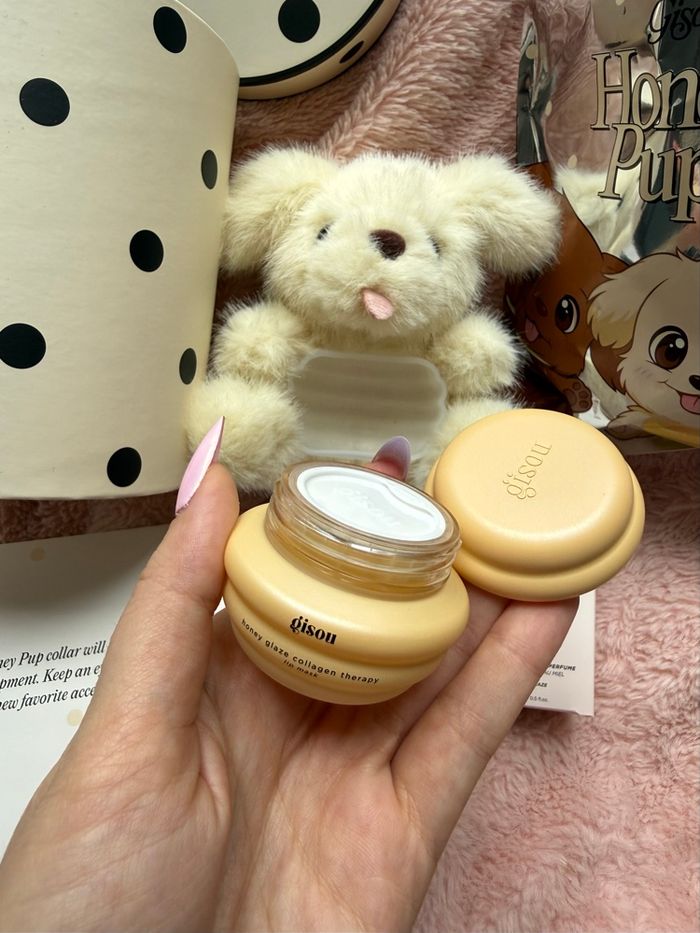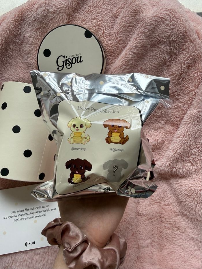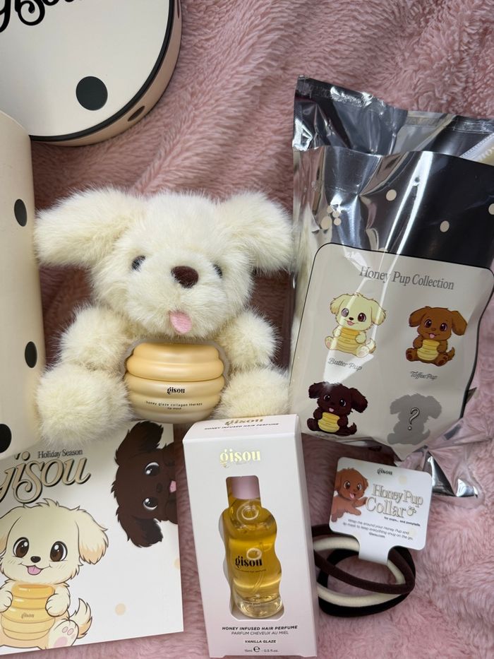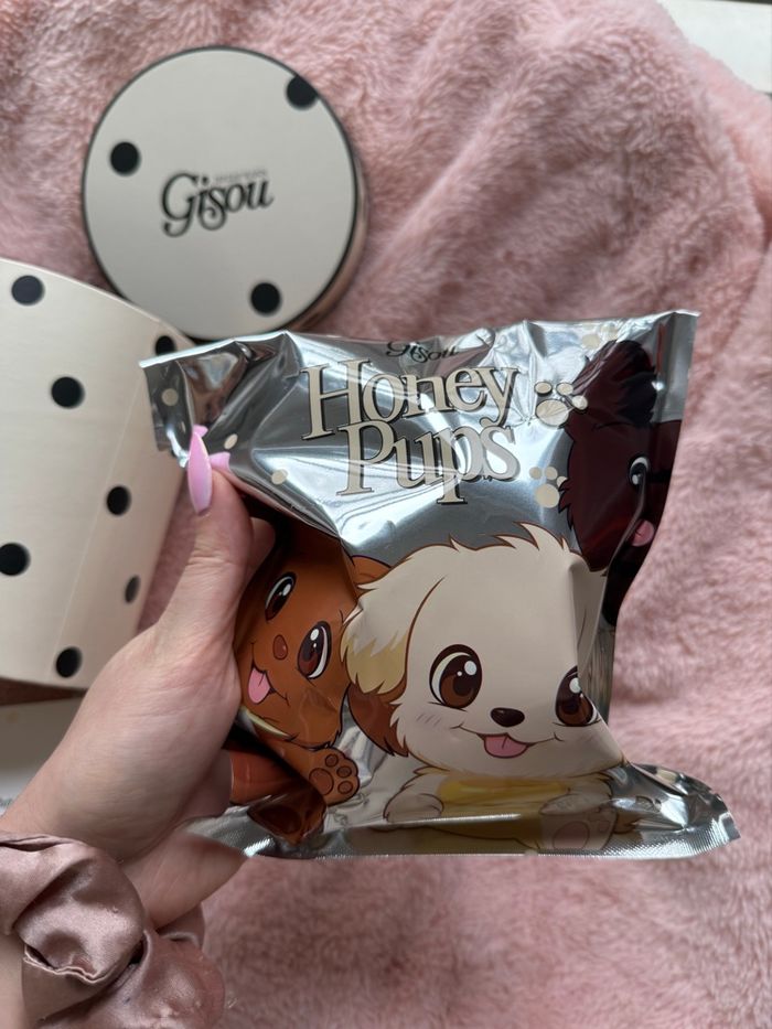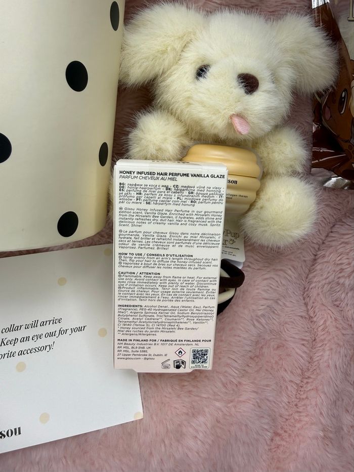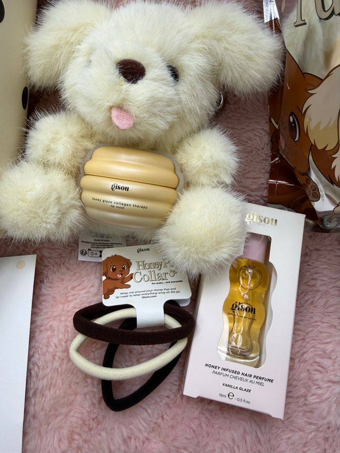 Peluche Gisou honey pups modèle Butter pup Vendu avec soin lèvre honey glaze collagen therapy avec son applicateur valeur 26€ et brume parfum cheveux au miel odeur vanille glaze valeur 22€ Élastique à cheveux protecteurs trois coloris