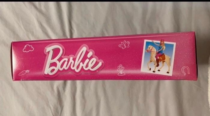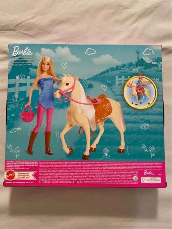 coffret barbie et son cheval neuf - en parfait état - jamais ouvert Le cheval est élégant avec sa robe crème, sa crinière et sa queue blanches toutes douces, ainsi que son harnais rose et sa selle marron qui peuvent s'enlever. Installez la poupée Barbie sur la selle pour une promenade à cheval : ses genoux se plient pour que ses pieds puissent tenir dans les étriers ! Barbie porte une tenue d'équitation décontractée composée d'un pantalon rose, d'un haut en jean bleu à pois blancs, de grandes bottes marron et d'une bombe rose.