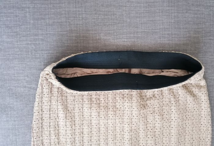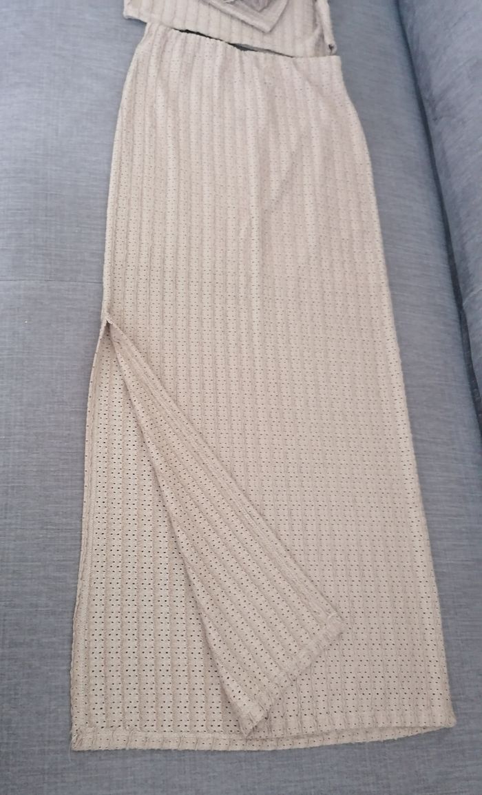 Ensemble 2 pièces femme, taille S. Beige. 97%polyester. 3%spontex -Jupe Taille élastique non réglable. Doublure jusqu'au les cuisses. Longueur jupe :1m.longueur de la fonte 45cm. -Le haut : longueur 37cm largeur 38cm manche longue. Jamais porté. 15€