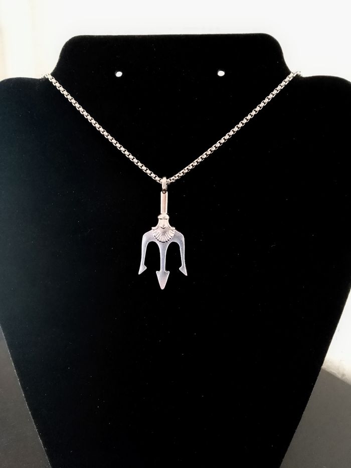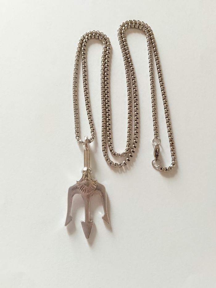Chaîne + pendentif spirituel. Pendentif : trident. (spirituel, protection, celtique, idéal cadeau) DESCRIPTIF : Couleur : argenté. Taille chaîne : 70 cm Diamètre pendentif : 2 cm L * 5,3 cm H Envoi rapide et soigné.