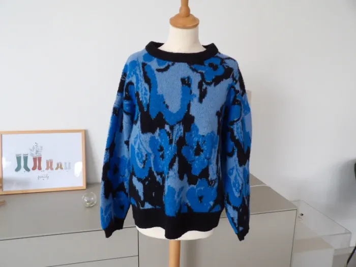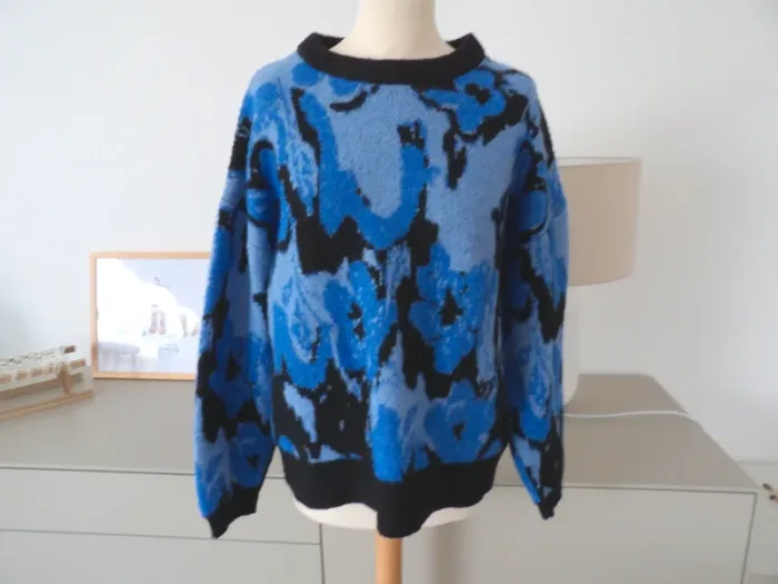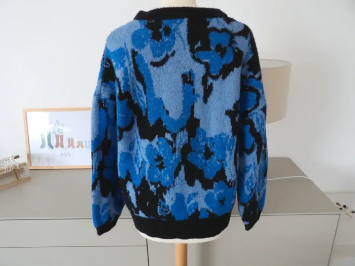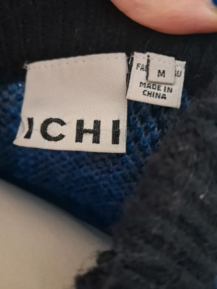 Magnifique pull hiver ton motifs bleu et noir, taille M 38, marque Ichi comme neuf.
