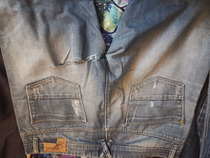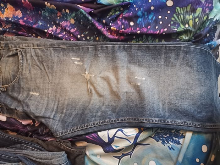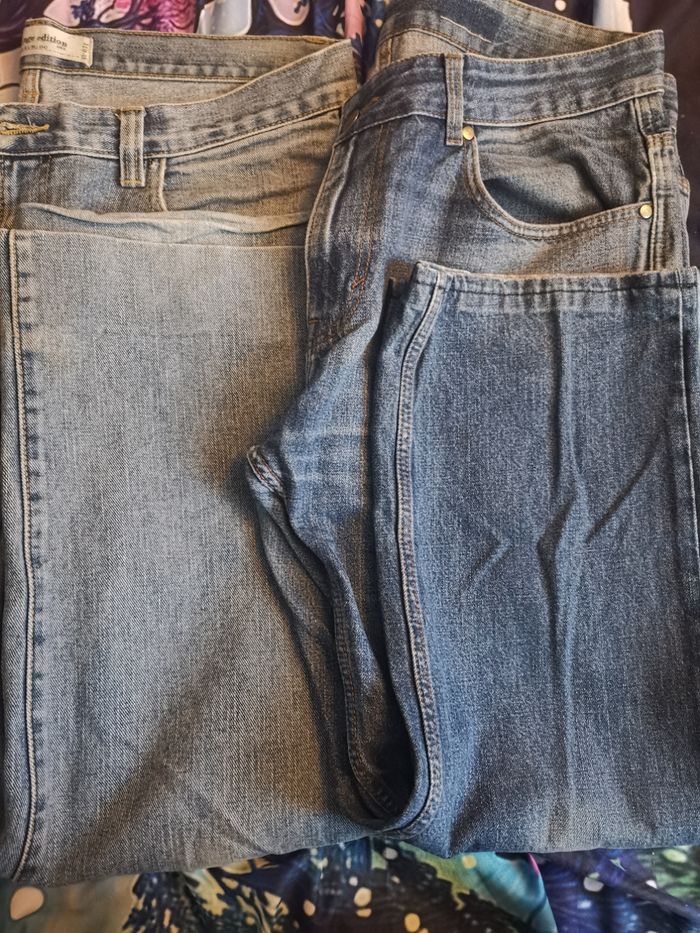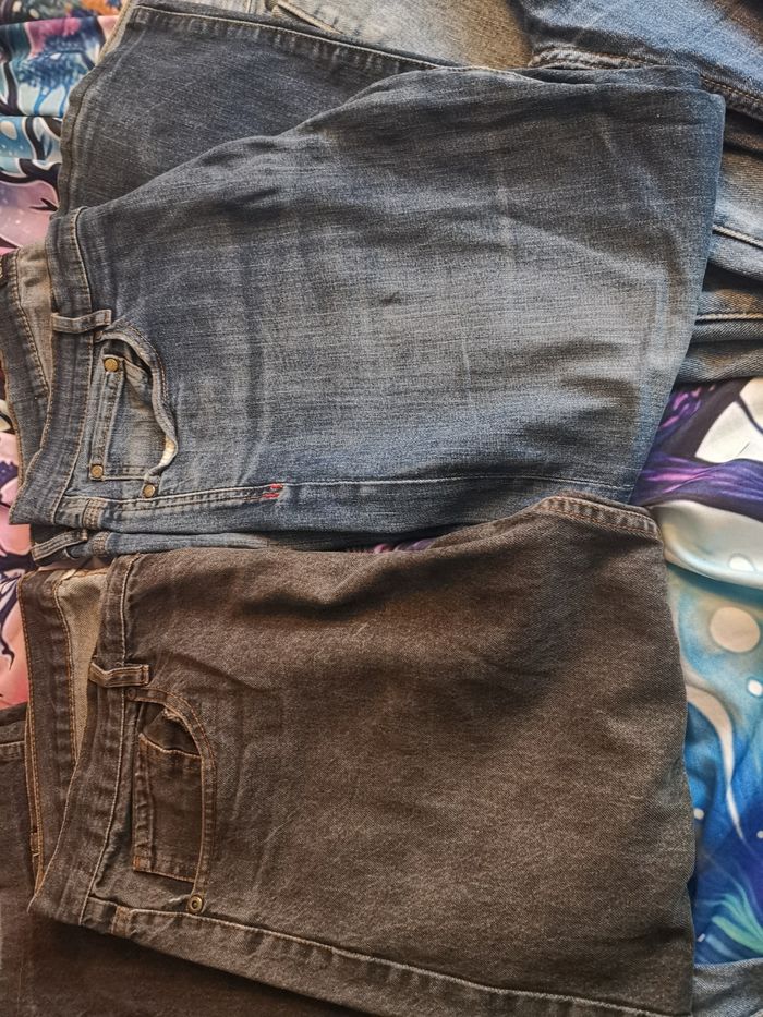 6 jeans classiques pour homme - coupe droite large - principalement de chez TEX (carrefour)- 5 bleus - 1 noir - taille 46-48 - hauteur totale 91-92 cm pour homme d'1m70 maxi. à noter bas de jambes effilochés - également 1 jean de chez Casual avec grande déchirure sous fesse droite, une petite devant et une bas de jambe, et quelques effilochages d'origine, taille 48 - étiquette arrière décollée. vendus soit en lot - soit séparément pour 3€ le jean - n'hésitez pas à me demander.