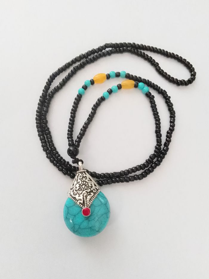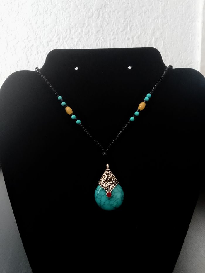 Collier bohème (bohème, ethnique, boho-chic, idéal cadeau) DESCRIPTIF : Couleur : bleu, noir, jaune, rouge. Taille chaîne : 63 cm Diamètre pendentif : 2,7 cm L * 4,1 cm H Envoi rapide et soigné.