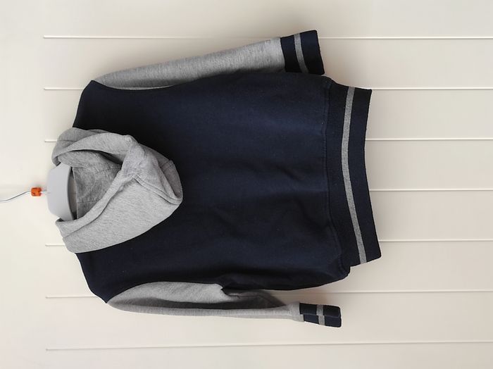 "Veste type universitaire pour garçon, taille 4 ans. ✨ Détails : • Fermeture par pressions • Capuche pratique • Poches devant • Motif écusson 🔎 État : De nombreuses bouloches mais reste en bon état, très fonctionnelle. Parfaite pour compléter un look casual et garder votre enfant au chaud 🍂"