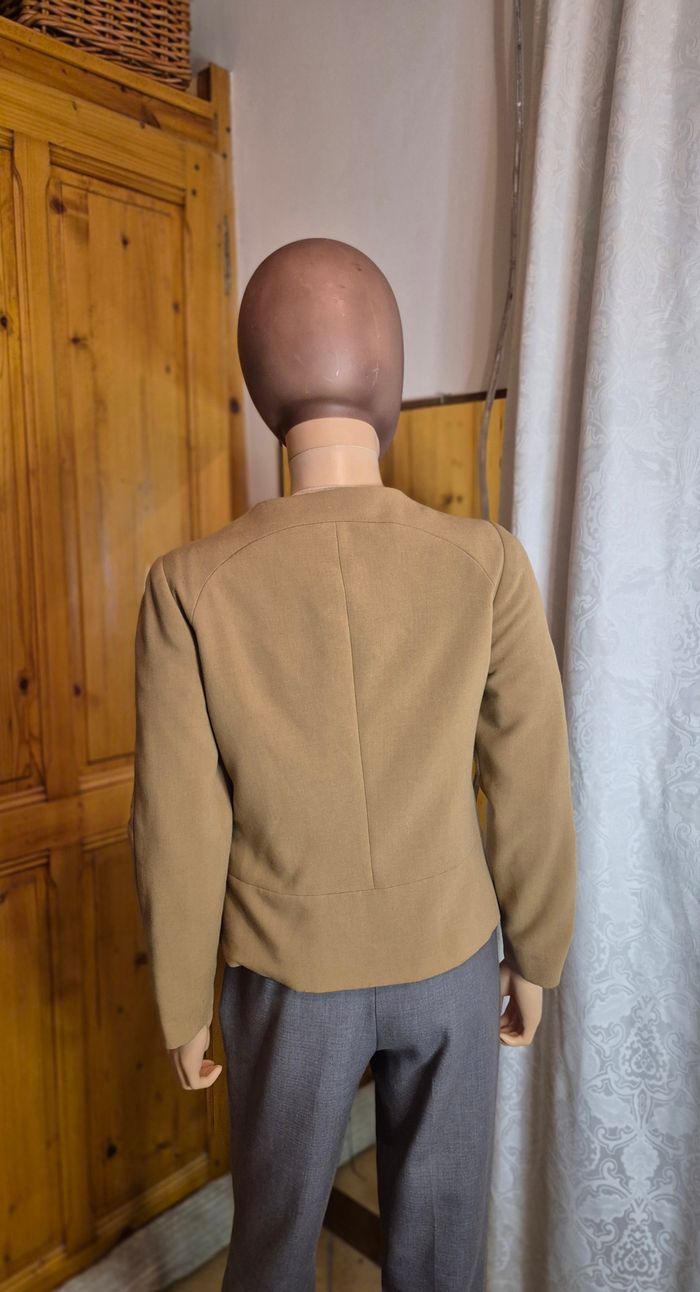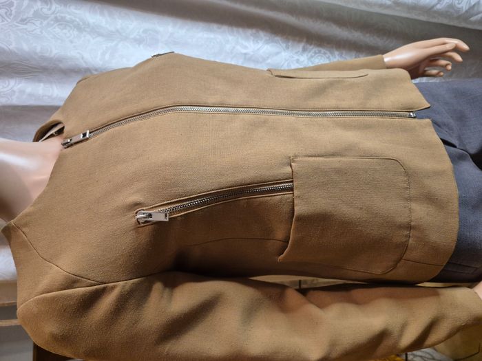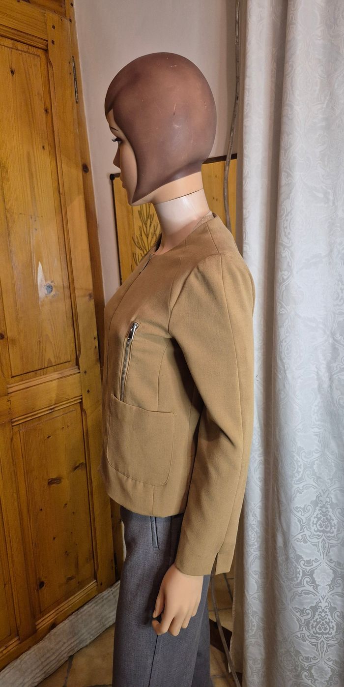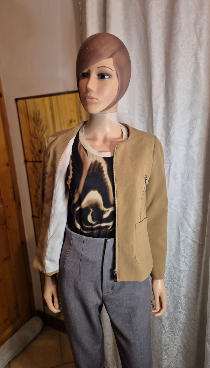 #cocy7310femme #38femmeMcocy7310 Blouson beige #Stradivarius Taille M, 2 poches + 2 fausses poches zippées 64% polyester, 31% viscose, 5% élasthanne Doublure 100% polyester Dimensions: épaules 38 cm., sous aisselle 44 cm. Hauteur 56 cm.