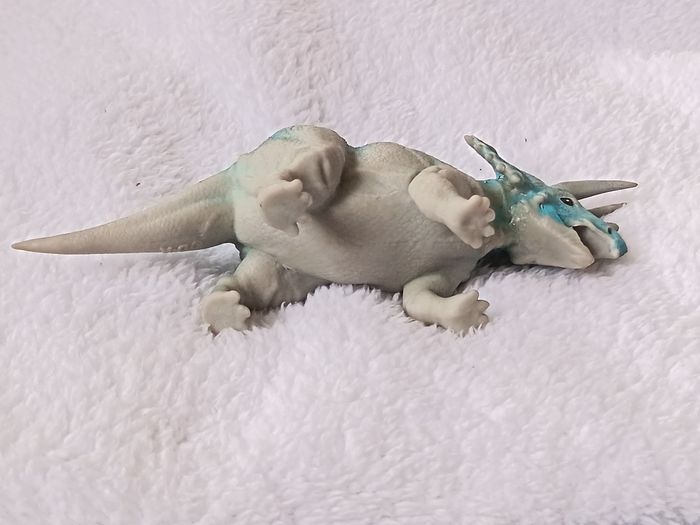 Vends figurine de dinosaure type Tricératops en caoutchouc souple. Couleurs : Corps bleu texturé avec des nuances de gris/beige. Dimensions : Environ 20 cm de long. Matière : Caoutchouc (résistant et agréable au toucher). ⚠️ État : La figurine a bien vécu et présente des marques d'usure visibles (peinture un peu effacée par endroits, voir photos sous tous les angles). Elle reste parfaitement fonctionnelle pour le jeu ou pour compléter une collection de "dinos" vintage. #skms62141_dinosaure #dinosaure #dinosaur #triceratops #jouet #figurine #jouetenfant #dino #figurinedinosaure #caoutchouc