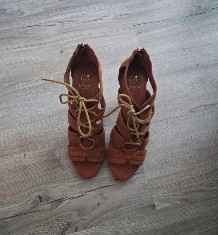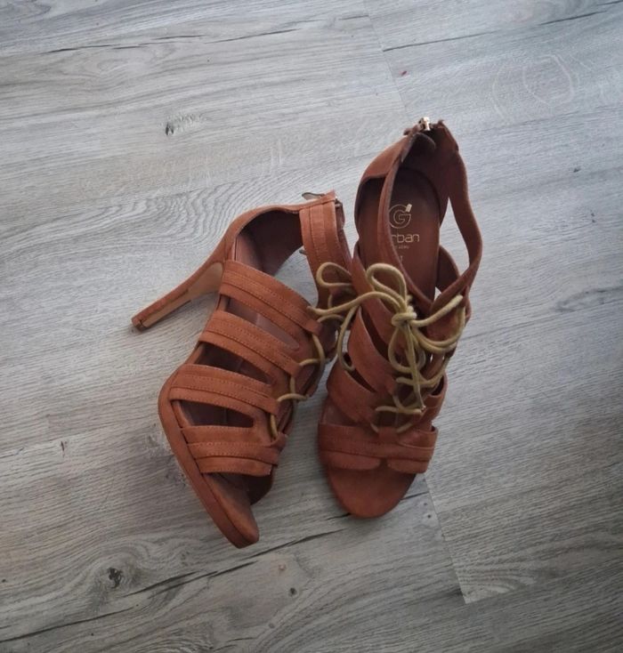 Magnifique talon ouvert a lacets. Taille 41. État neuf. Couleur camel. Talon de 8cm.