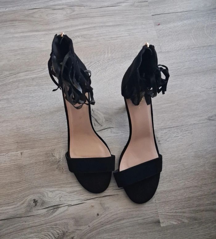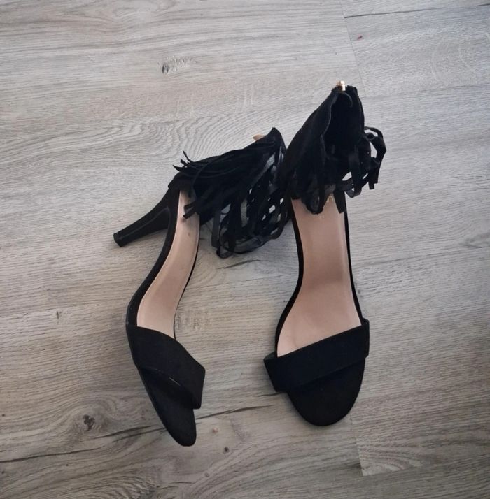 Jolie talon ouvert noir avec petite frange. Taille 41. Très bonne état. Talon de 5cm .