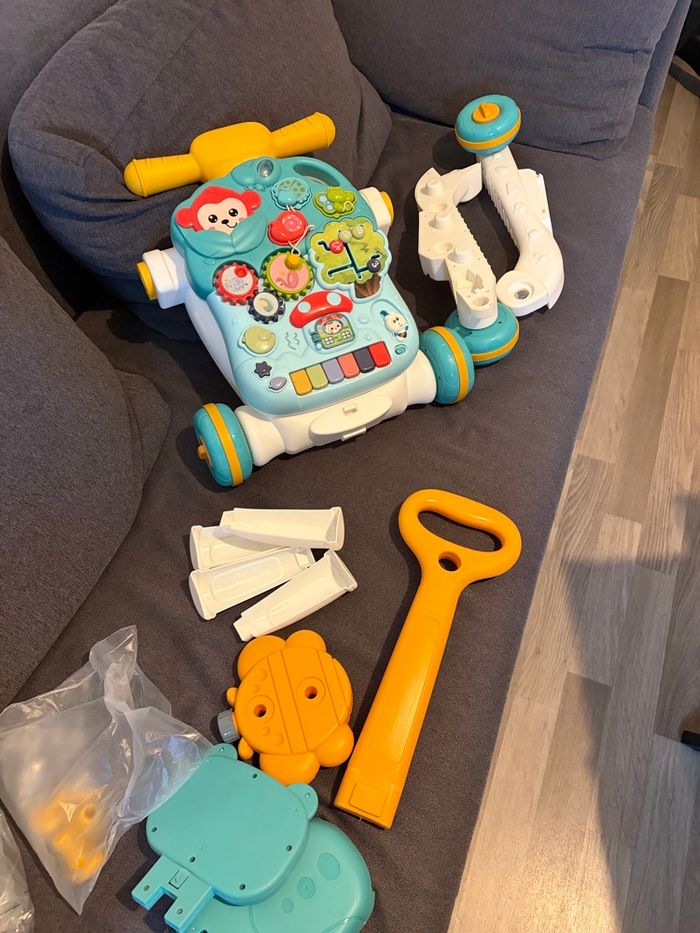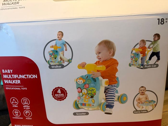 Pouss pouss 3 en 1, y fais scooter, table d’activité, pouss pouss. Servi 1 mois. Encore dans le carton. d’origine