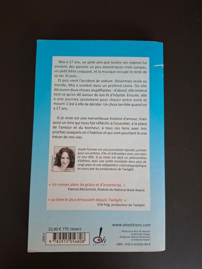 Roman Si je reste de Gayle Forman en bon état Éditions Oh Tout sourit à Mia, dix-sept ans, des parents formidables, bien que restés dans leur période punk, une carrière de chanteuse déjà bien lancée... La seule ombre au tableau est le choix qu'elle doit faire pour ses études : rester fidèle au premier amour de sa vie, la musique, et partir l'étudier loin de ceux qu'elle aime. Ou renoncer à sa passion. Mais un accident de voiture fait tout basculer. Ses parents sont tués sur le coup, Mia est dans un coma profond. Elle a maintenant une journée pour décider ce qu'elle veut faire : vivre ou mourir. Le seul choix qui compte, en fait. Pendant cette longue journée où son esprit est déconnecté de son corps gisant, tous ceux qu'elle rencontre sans qu'ils la voient vont peser sur sa décision. Laquelle changera cent fois... et une dernière fois encore.. Jolie histoire belle, émouvante, bouleversante.. Prix d'achat 15.90 euros