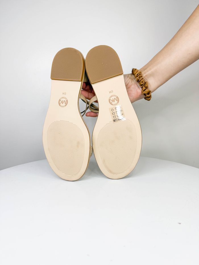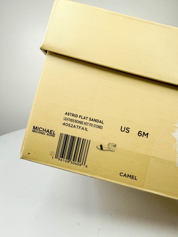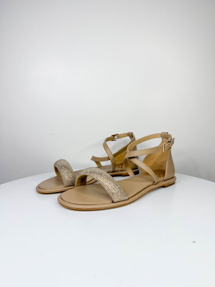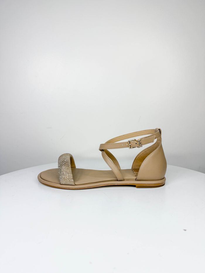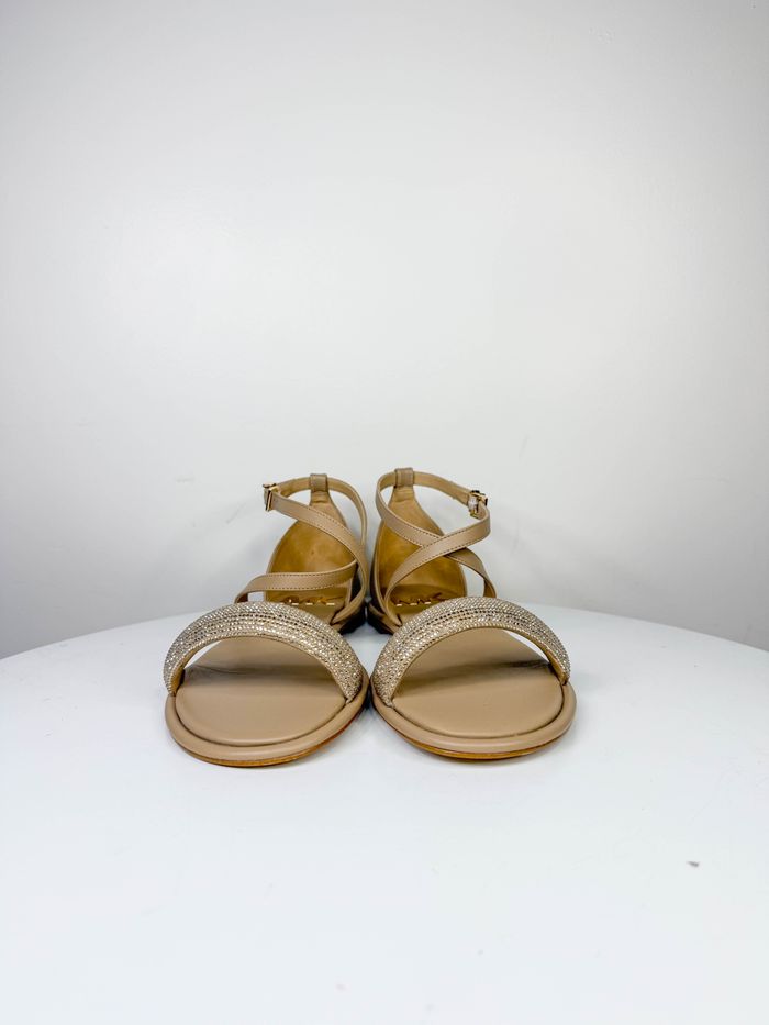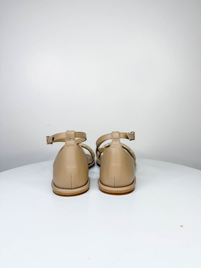 Sandales en cuir beige ornées de strass. Jamais portées, neuves avec boîte.
