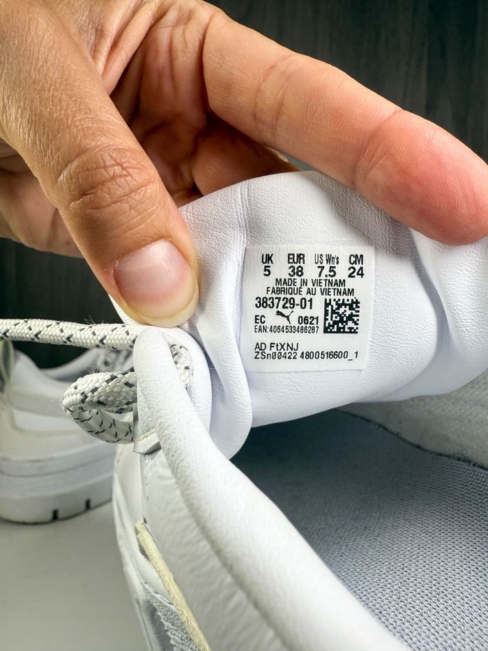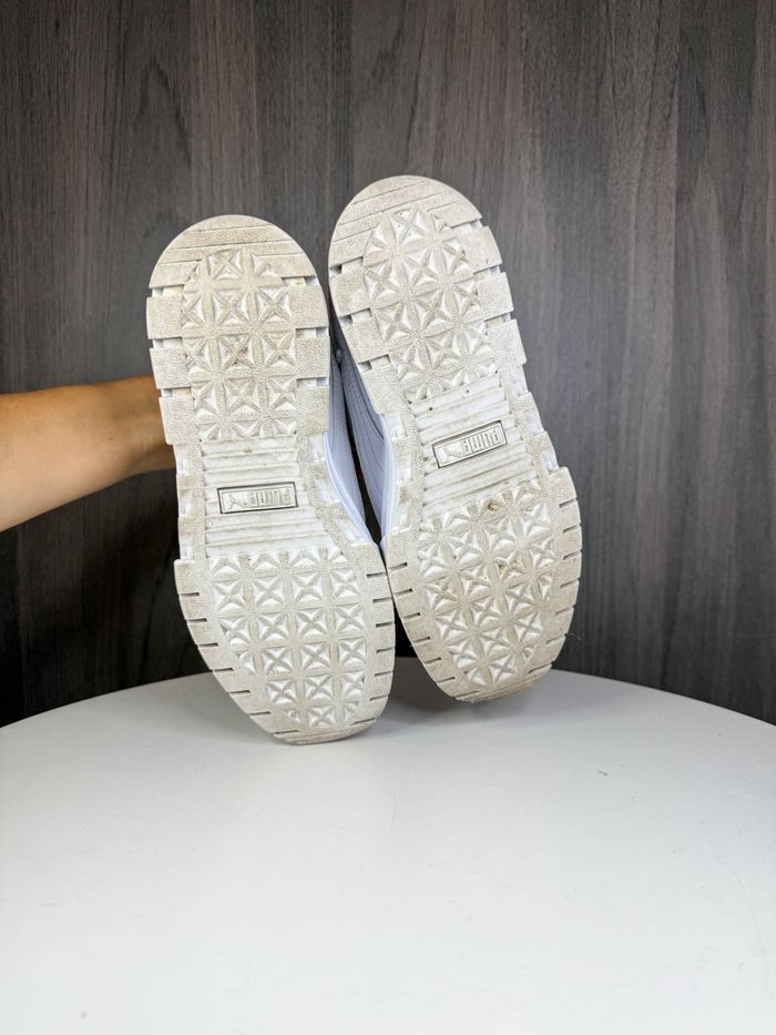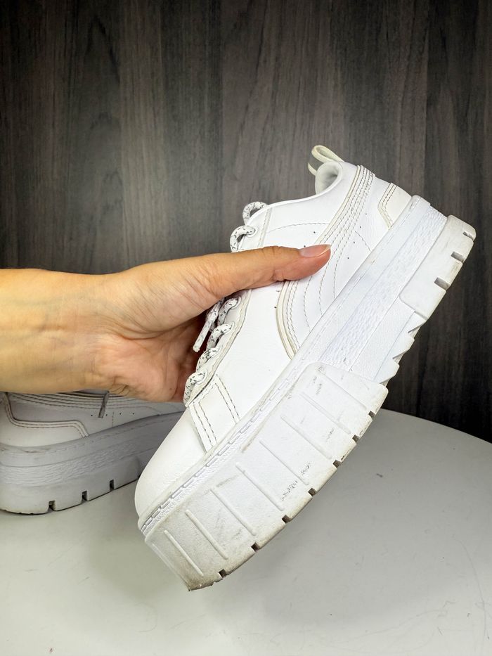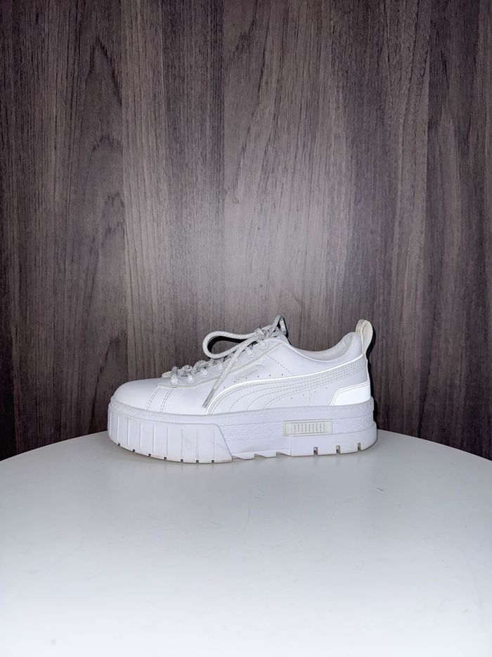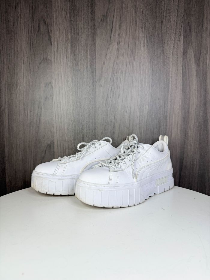 Baskets blanches à semelle compensée et éléments réfléchissants. Portées mais encore en bon état, quelques petites marques.