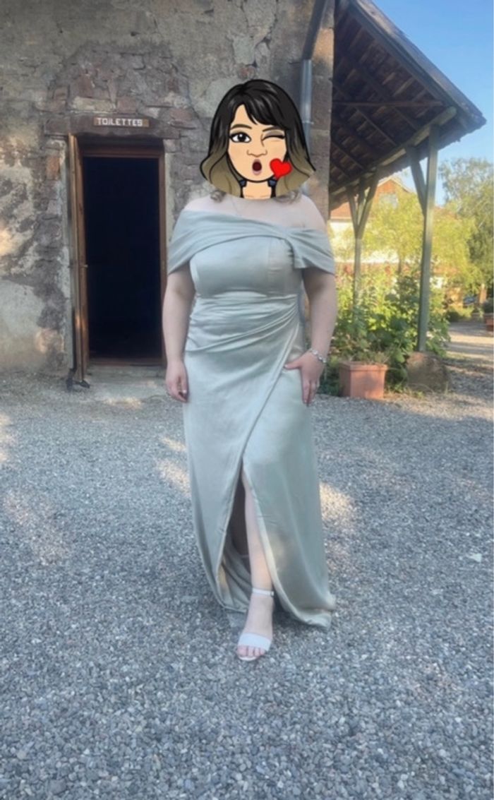 Robe de soirée vert sauge • Encolure style Bardot • Fermeture éclair au dos • Jupe portefeuille • Fente • Coupe classique Tissu satiné: brillant, drapé et soyeux En très bon état porté 2h. Elle a été lavé . Achats 140€ prix vérifiable sur le site #asos #sauge #demoiselledhonneur