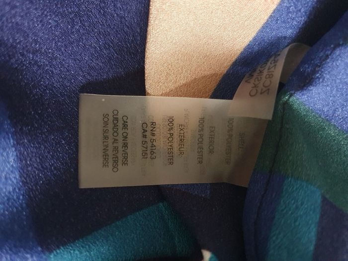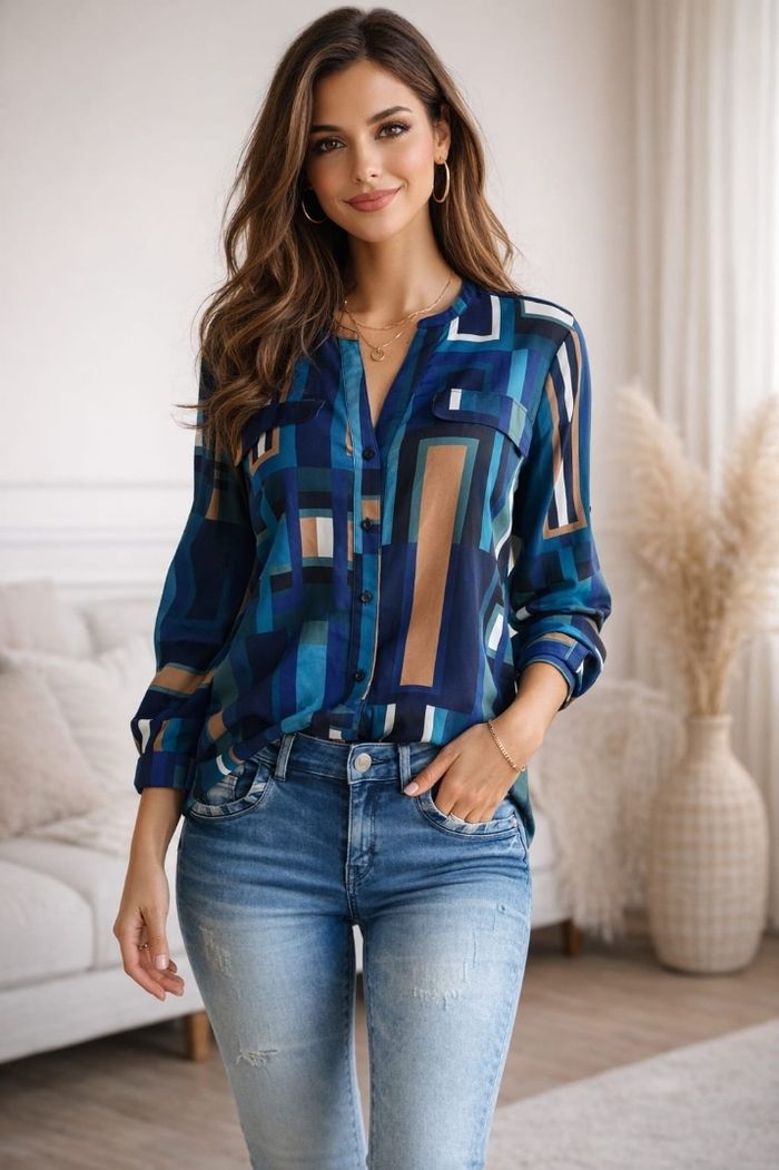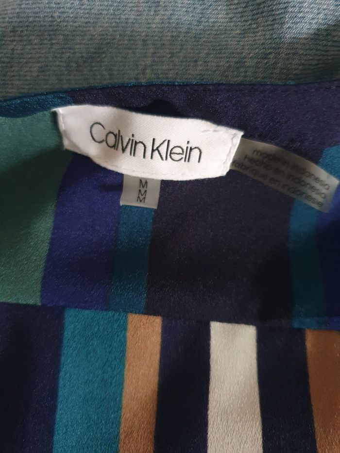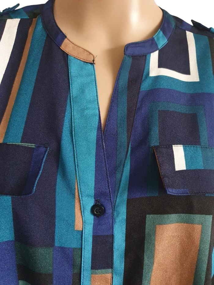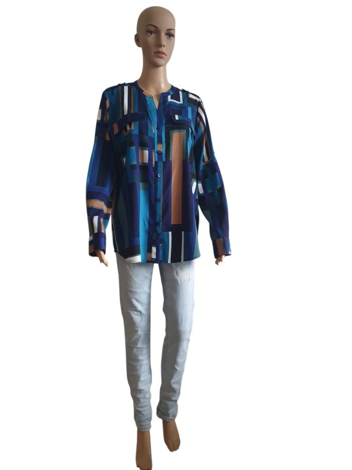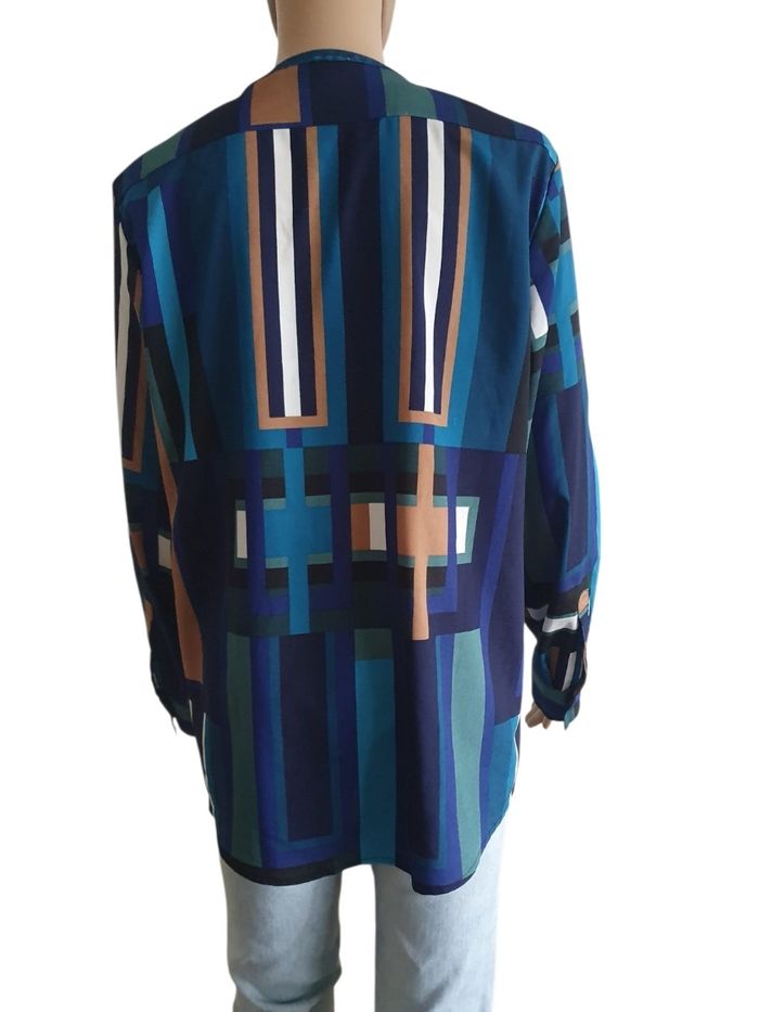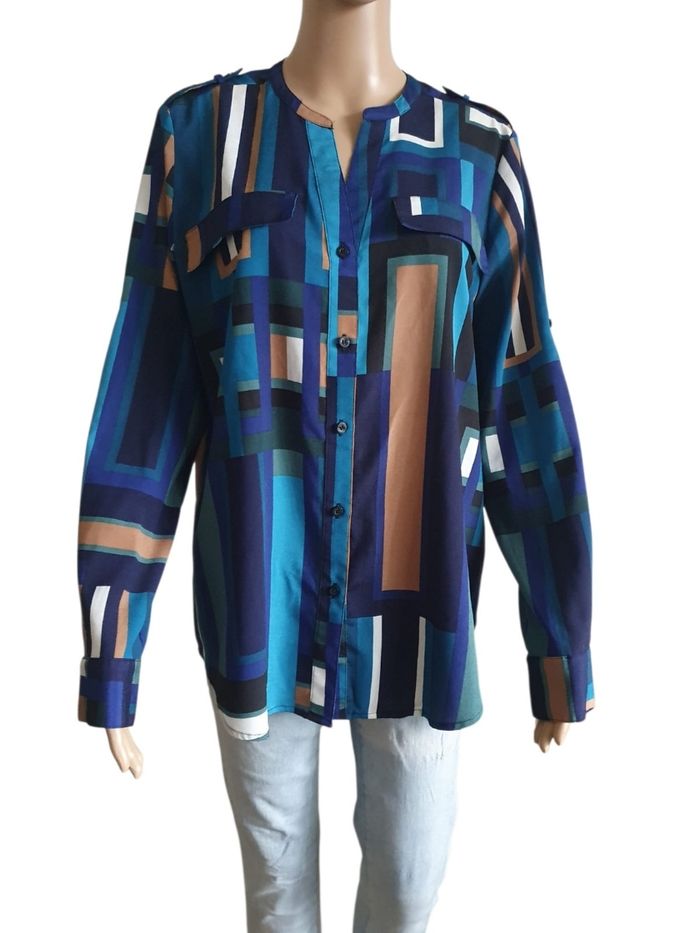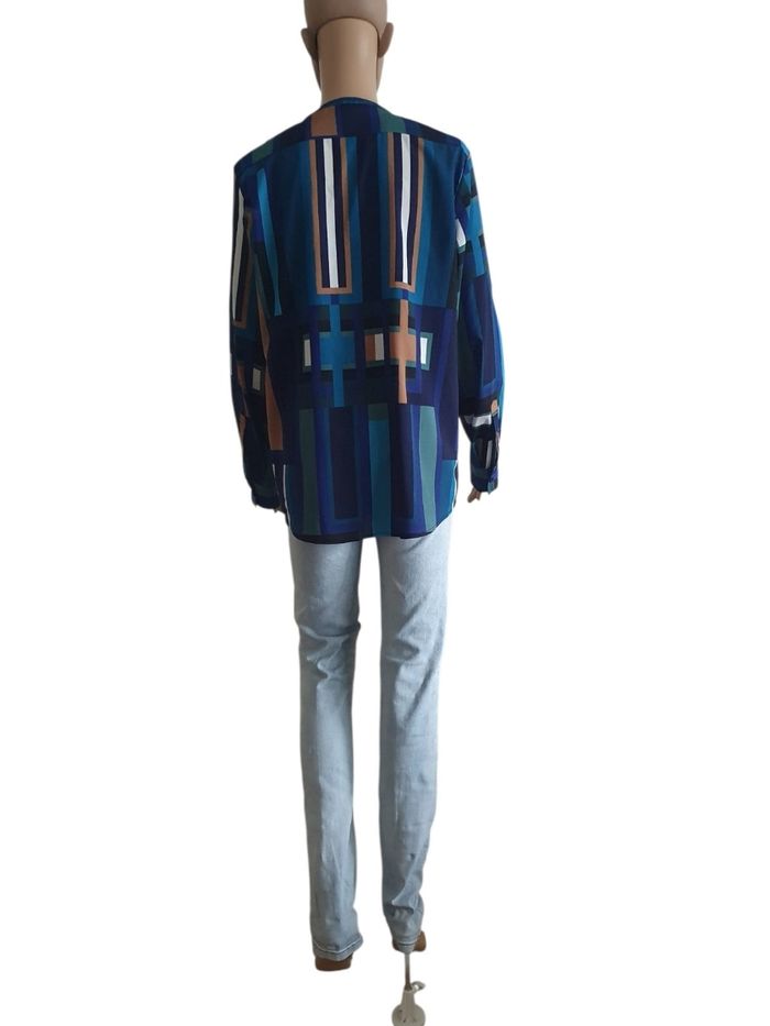 Affirmez votre style avec cette superbe chemise/blouse Calvin Klein. Son motif graphique unique,  mêlant bleu de minuit, turquoise profond et touches de caramel,  apporte une allure haut de gamme et contemporaine. 💙 Une silhouette fluide avec un col tunisien élégant qui dégage le port de tête.  🤎 Rabats décoratifs sur la poitrine pour une touche structurée et pattes de boutonnage aux épaules.  🩵 Manches longues avec boutons aux poignets.  🤍 Le tissu est léger,  soyeux et Infroissable,  idéal pour les journées actives. 📏  Pour vous assurez qu'elle vous ira parfaitement,  fiez vous à la grande sagesse de Maître Ruban ! ⤵️ Taille étiquette : M (38) Longeur : 73cm  Aisselle à Aisselle : 53cm Épaule à Épaule : 43cm  Manche: 63cm 💰 Prix neuve : 90€ 🌟 Très bon état