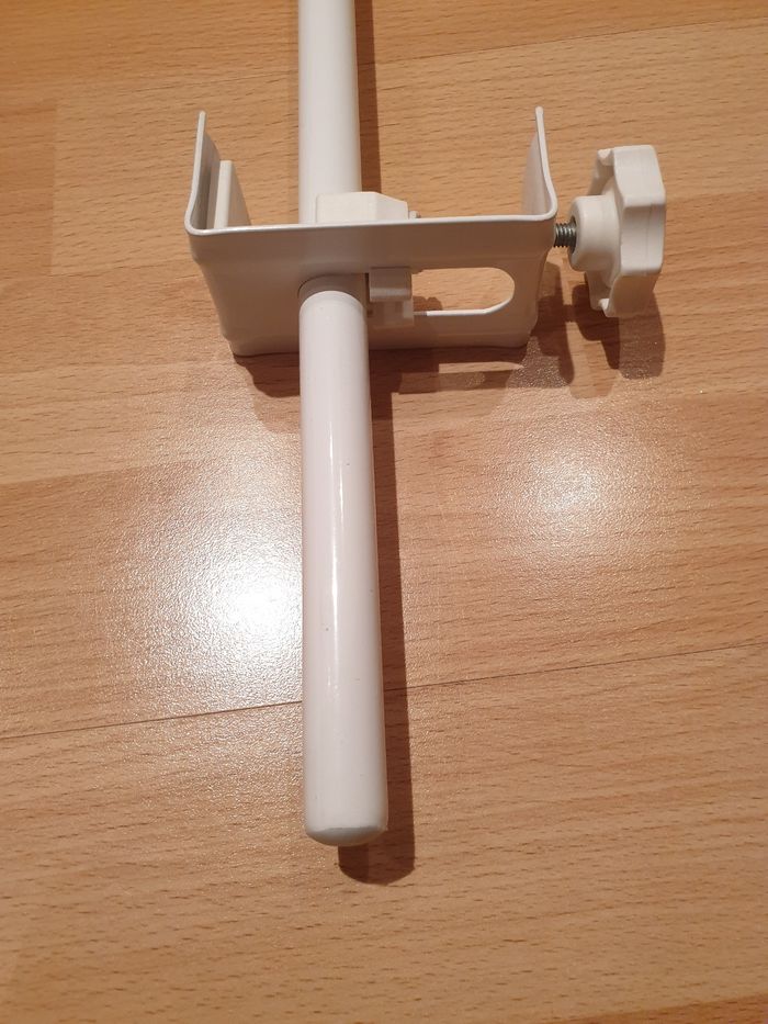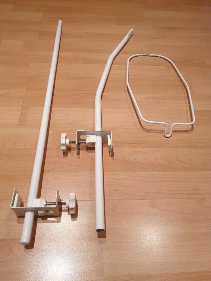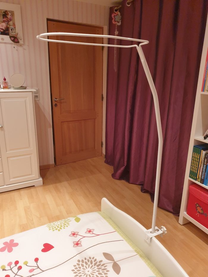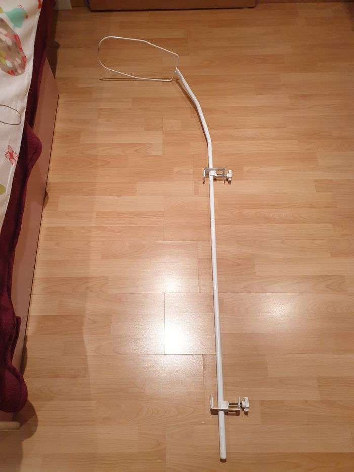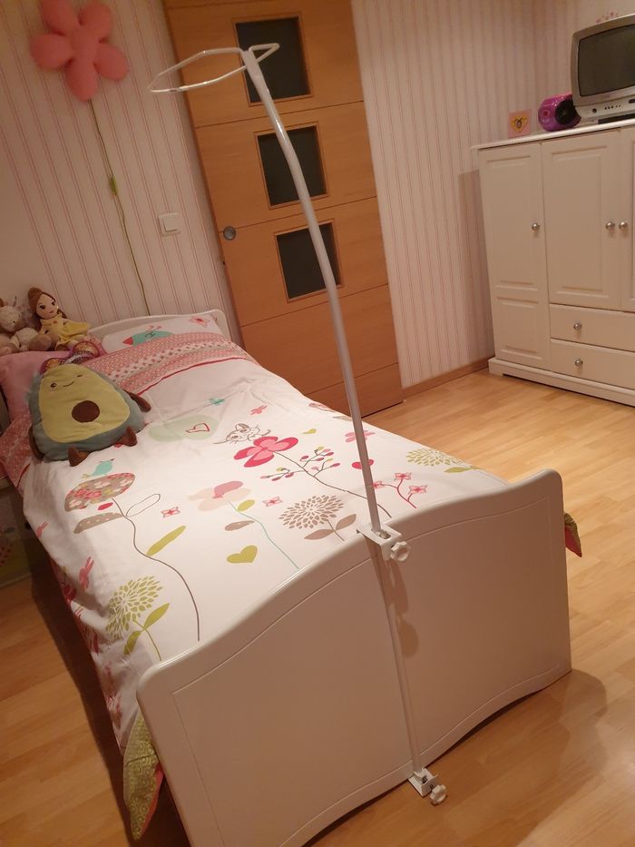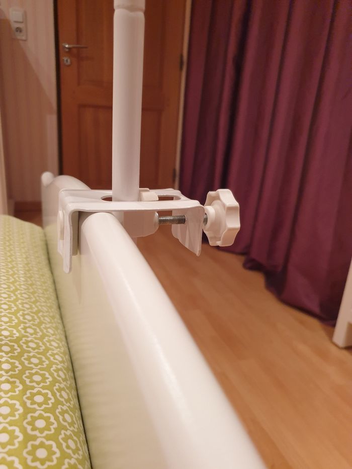 Elle se compose de 3 parties qui s'emboîtent facilement et se montent très rapidement sur le lit en ajustant les molettes, sans aucun trou ni outil. Pour la photo je l'ai fixée à un grand lit, en général on l'utilise plutôt pour un lit à barreaux. Vendue sans rideau.