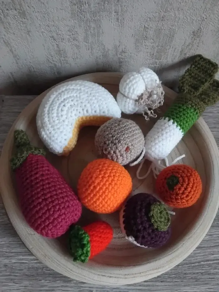 Lot de dînette jouet lavable crochet comprenant un fromage, ail, pomme de terre, navet, orange, poireau, clémentine, fraise, aubergine. Bonjour vous pouvez retrouver toutes mes créations sur www.crochetstyle.fr