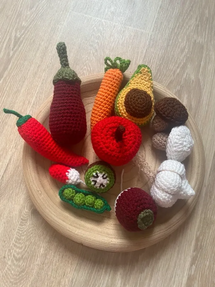 Lot de dînette jouet lavable crochet comprenant une aubergine, carotte, pomme, navet, piment, petit pois, kiwi, avocat, ail, 2champignons, radis. Bonjour vous pouvez retrouver toutes mes créations sur www.crochetstyle.fr