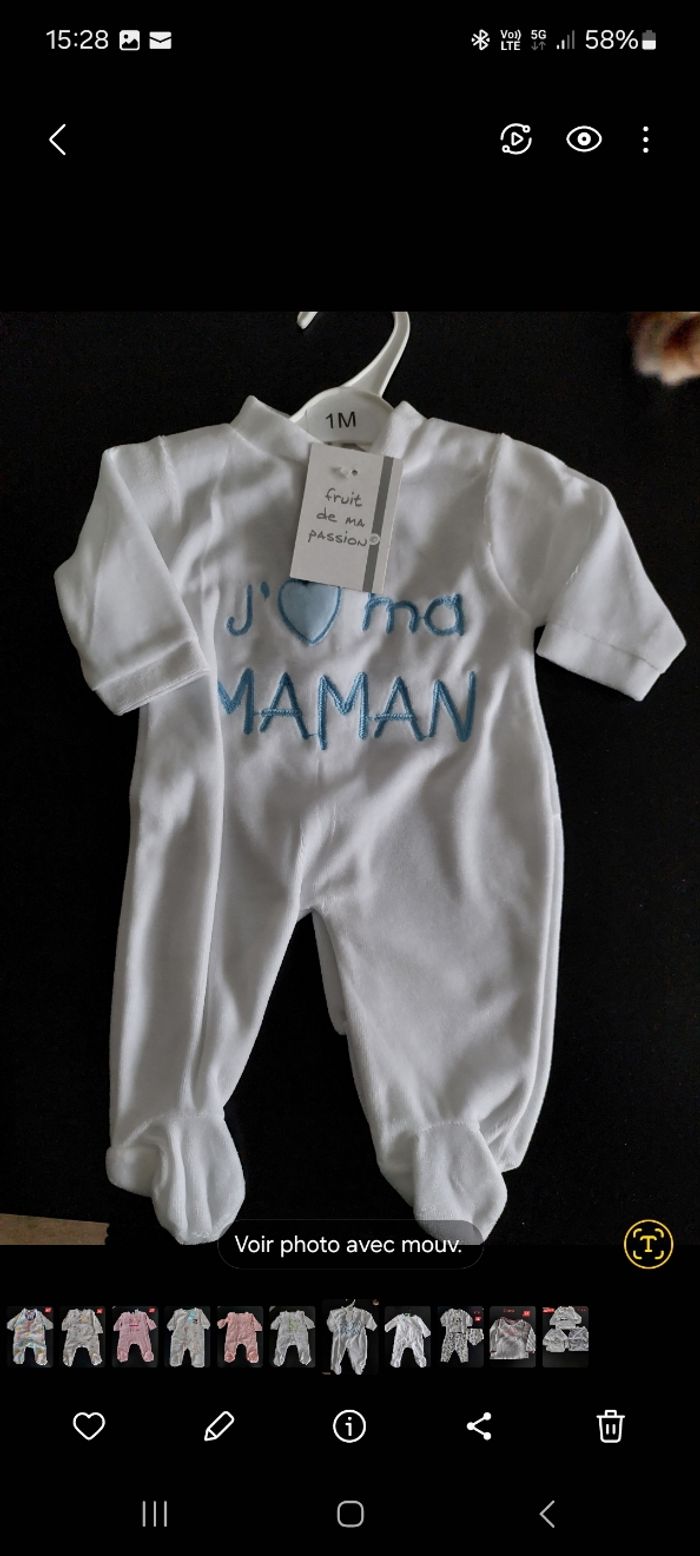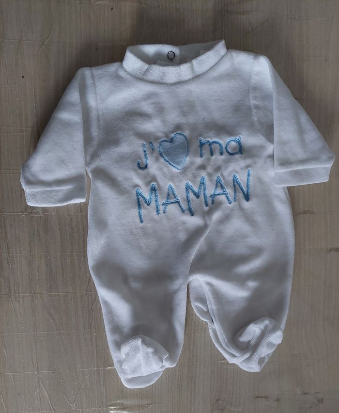 Vends Lot de 2 grenouillères fille 1 mois Il y'a écrit : J'aime ma maman J'aime mon papa Elles sont en très bon état car très peu mises Maison non fumeur