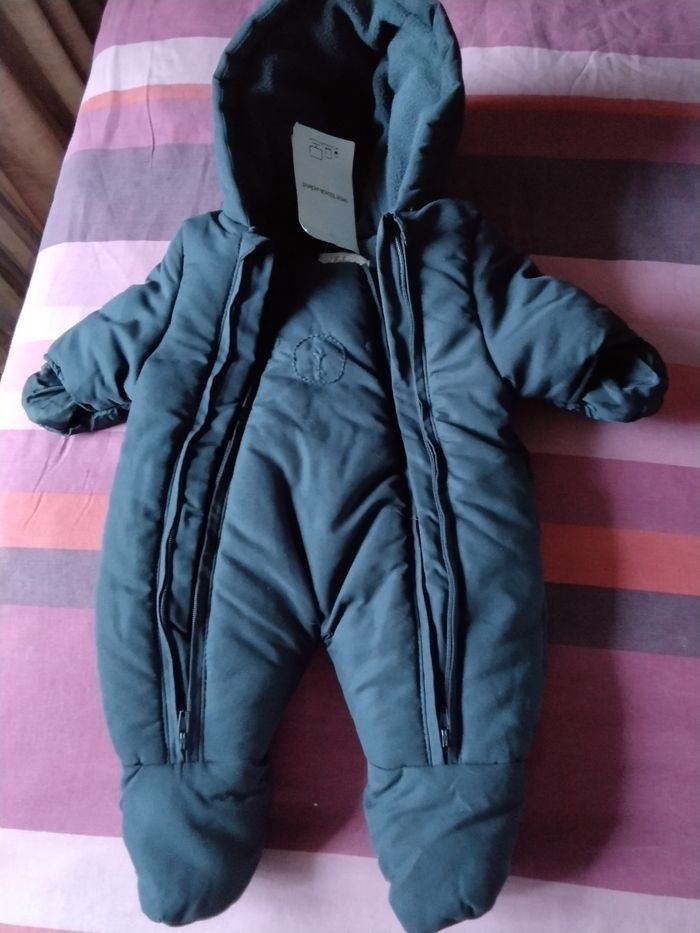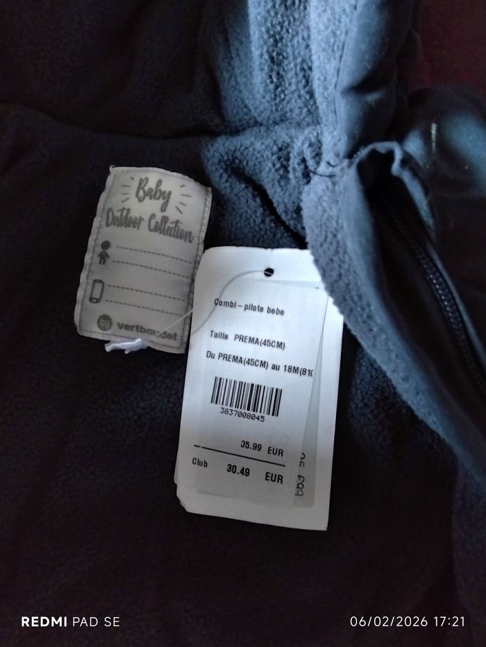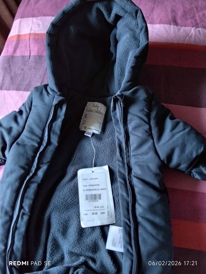Combipilote bébé, Vert Baudet, double ouverture totale, bleu marine, prema (45cm) neuve. Mixte Description internet Combi-pilote bébé doublée maille polaire Parfaitement adaptée aux premiers jours de bébé Ouatinage épais et chaud Doublure en maille polaire pour avoir bien chaud Ouverture totale par une double glissière pour habiller bébé sans le gêner Capuche doublée qui réchauffe et protège la tête Motif devant Moufles intégrées et repliables Etiquette pour inscrire son nom à l'intérieur