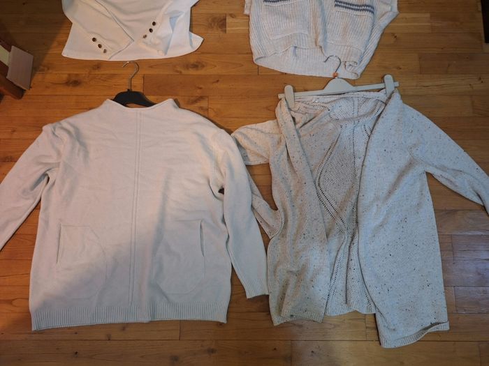 Je vends ce lot comprenant Un.haut blanc chiche taille L Un cardigan beige taille 3 Un gilet blanc creme liseret bleu kiabi taille L Un pull blanc poches taille.L.Xl Prix du lot 20 euros