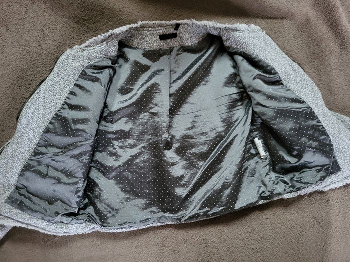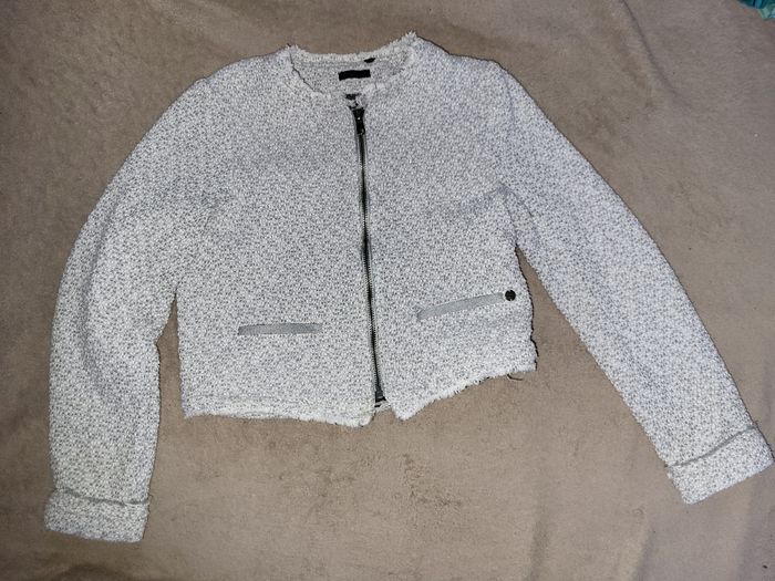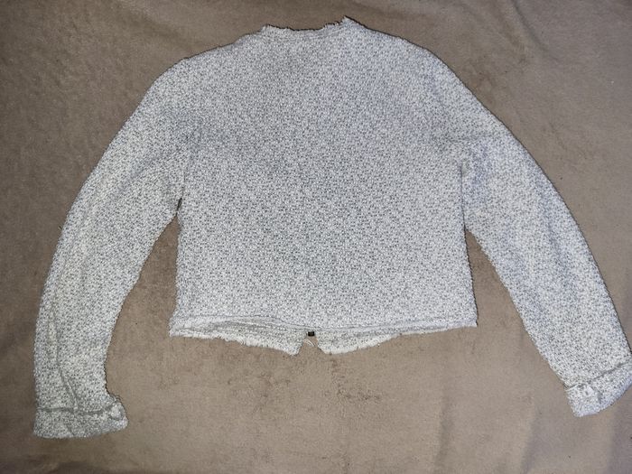 Veste courte fille IKKS Blanche et grise avec fils métallisés Fermeture éclaire 77% coton 16% polyester 7% acrylique Portée plusieurs fois #virgy61fille10ans