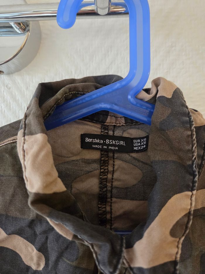 Chemise manche longue, retrousable avec un bouton pour faire des manche 3/4 motif militaire avec tissu leger et poche sur la poitrine Bershka Taille xs Très bon état Aucun défaut Prix négociable Remise en main propre possible