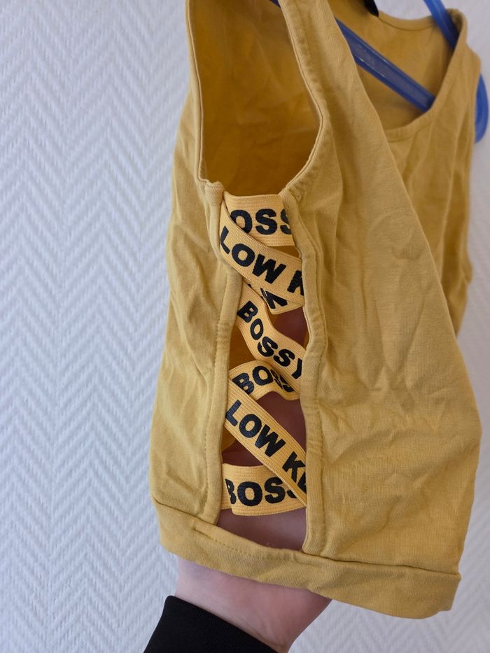 Crop top jaune sans manche avec lanière sur les coter laissant apparaître les cotes - photo numéro 4