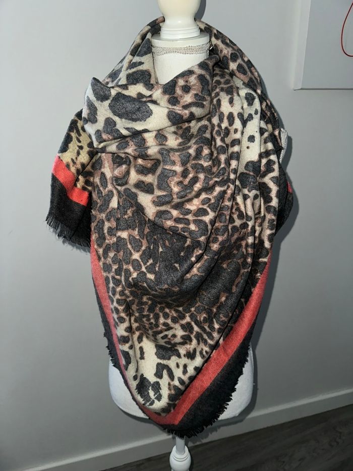 Écharpe châle oversize léopard beige gris orange 130x130cm