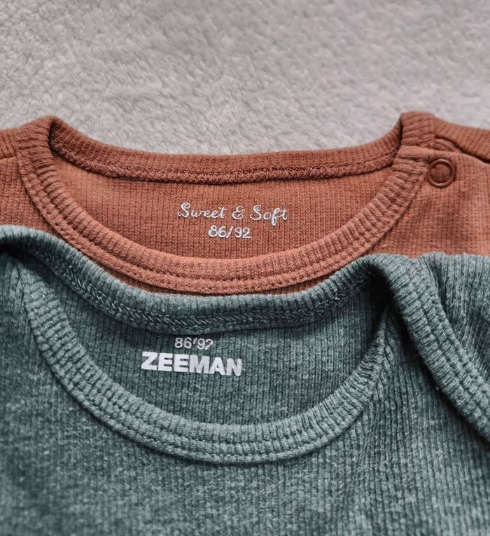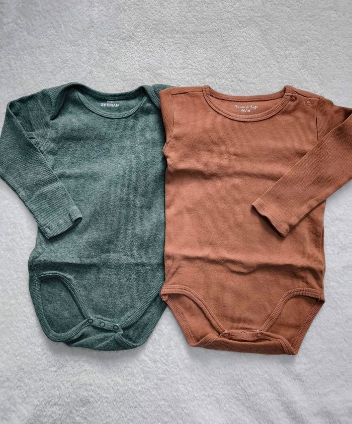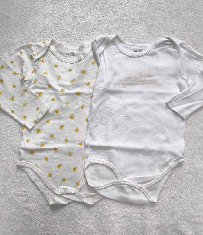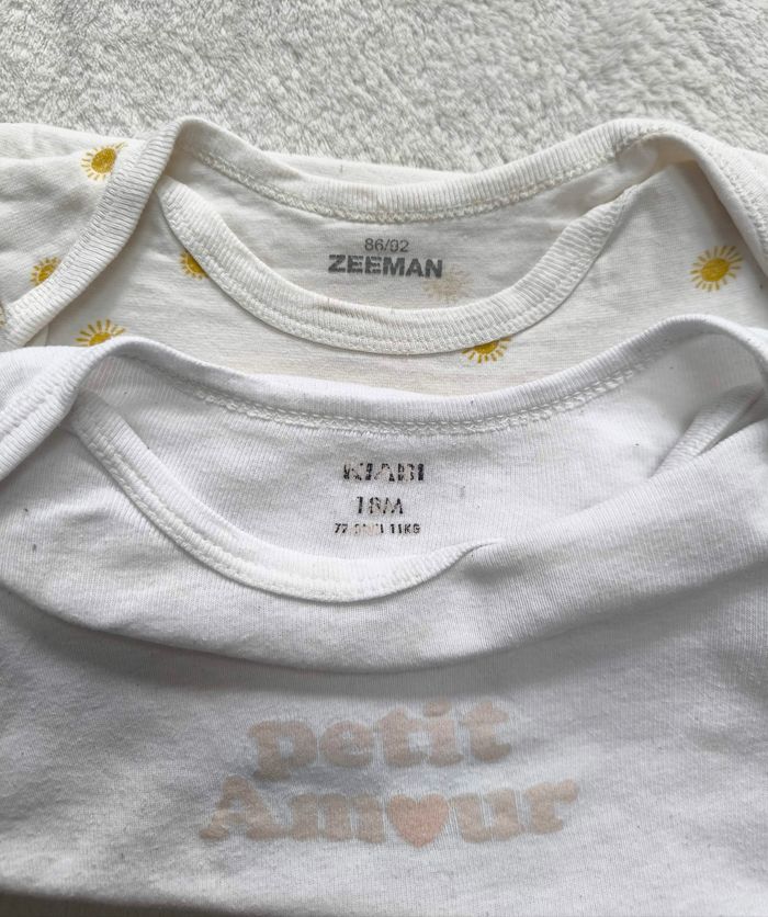Lot de 6 bodies 3 Zeeman ( 86-92) 3 Kiabi (2 18 mois , 1 24 mois) Très bon état sauf 1 en bon état flocage