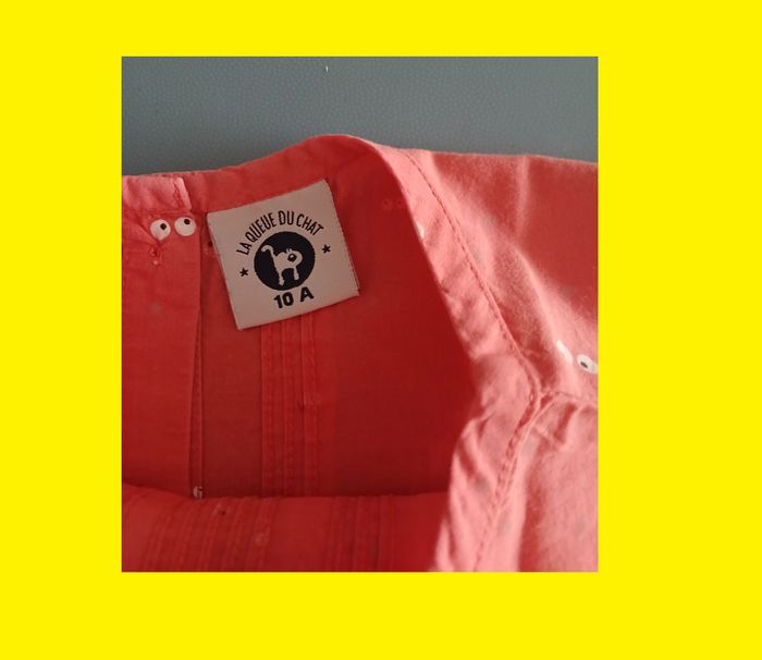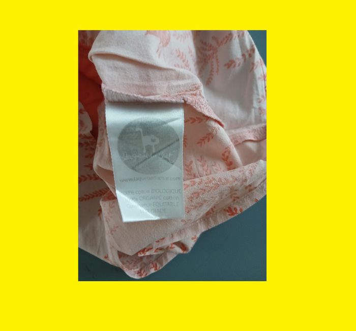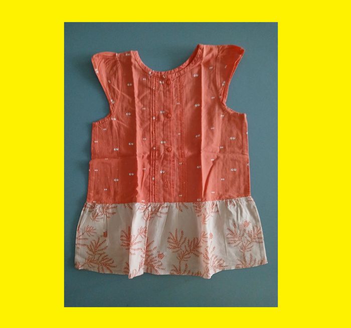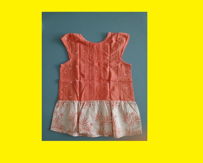 manque un bouton en bas dans le dos boutonné dans le dos (4 boutons, manque 1, donc 3) deux types de tissu orange yeux de chat orange clair avec feuilles volant couvre épaule pli au milieu devant et dos 100 % coton bio made in India
