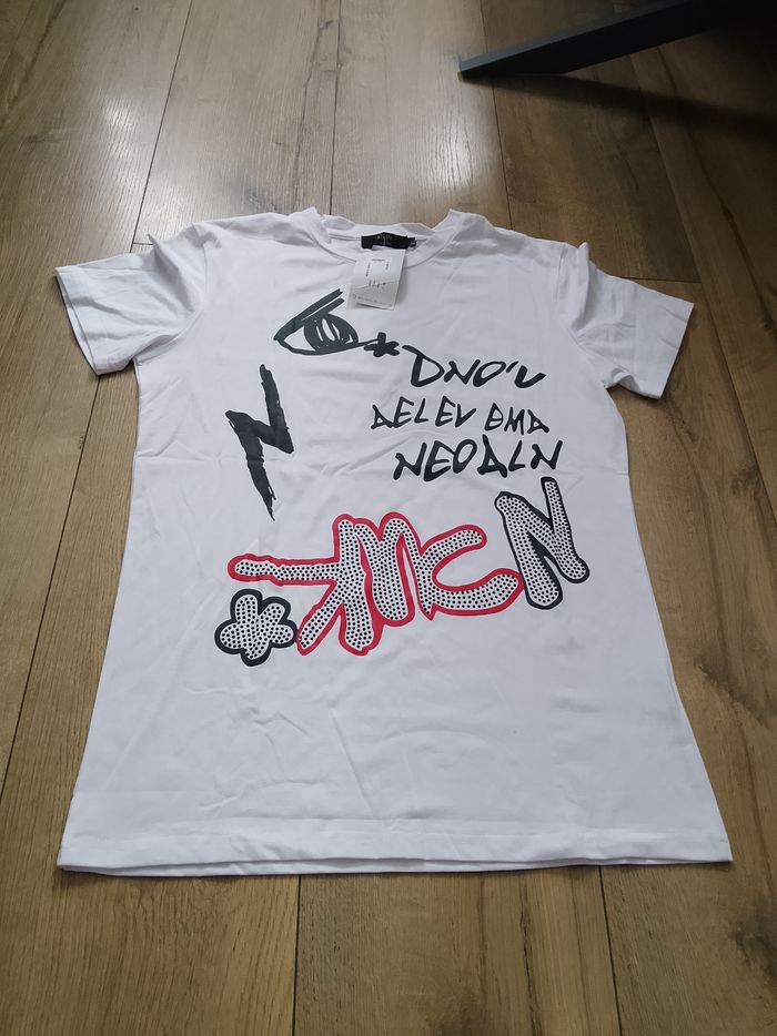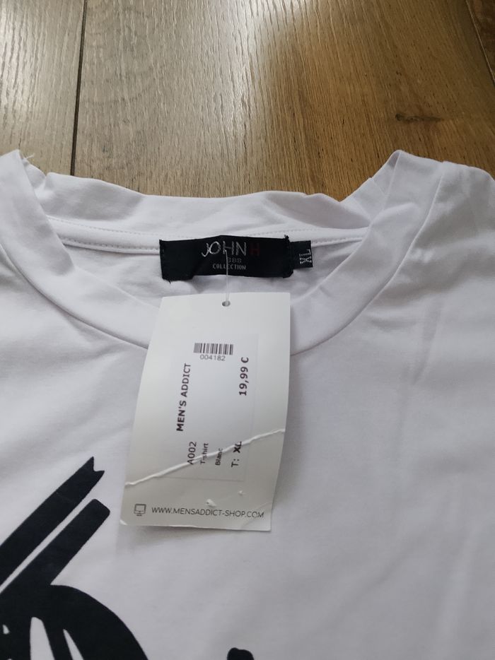 T-shirt blanc pour homme, manches courtes, flocage sur le devant, uni sur l'arrière. Taille : Étiqueté en XL mais correspond plus à un L. Marque : John'H Mesure dessous de bras à dessous de bras : 49 cm Article neuf avec étiquette. Vendu en magasin au prix de 19,99€. A002 blanc XL N°1