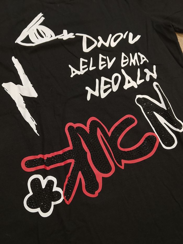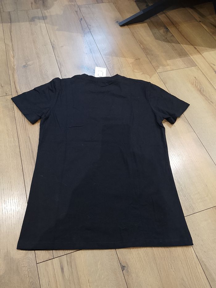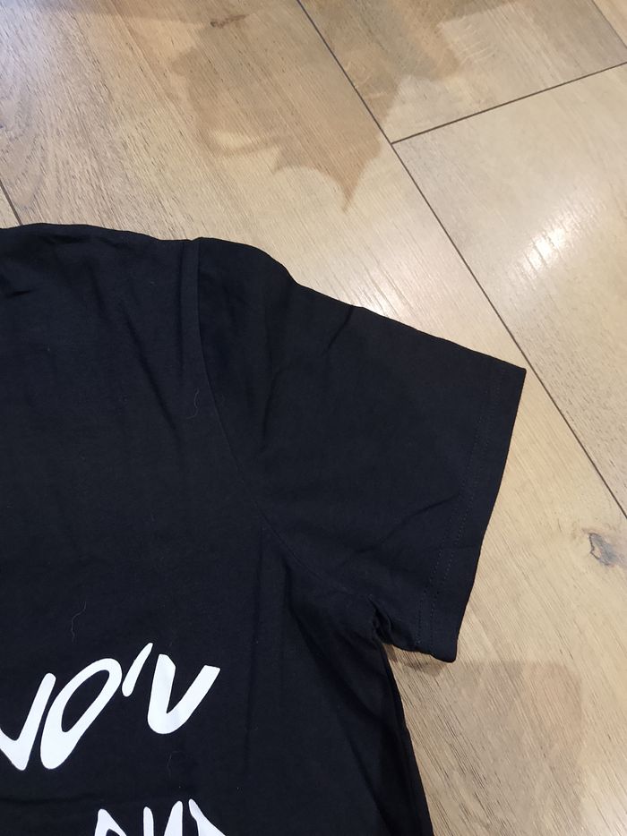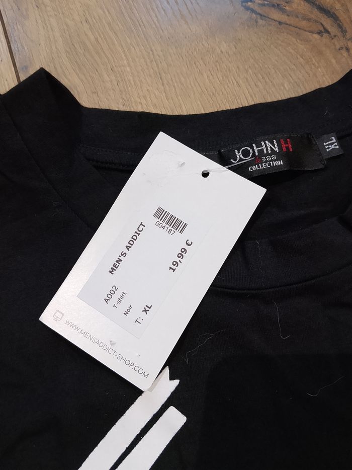 T-shirt noir pour homme, manches courtes, flocage sur le devant, uni sur l'arrière. Taille : Étiqueté en XL mais correspond plus à un L. Marque : John'H Mesure dessous de bras à dessous de bras : 49 cm Article neuf avec étiquette. Vendu en magasin au prix de 19,99€. A002 noir XL N°1