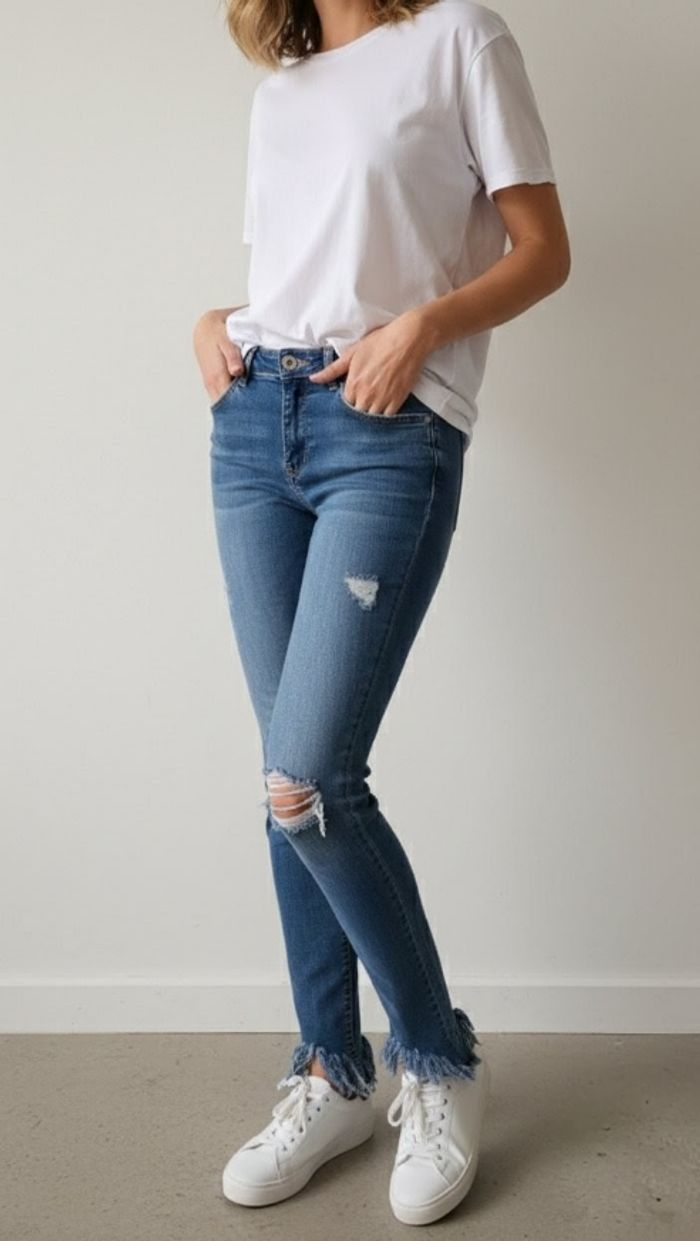 Jean Slim Bleu Délavé Laulia Détails Distressed et Franges