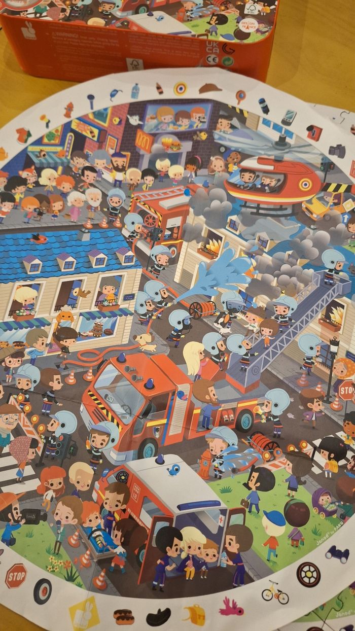 Puzzle Janod thème pompier Construit 1fois boîte, puzzle et fiche modèle en parfaite état