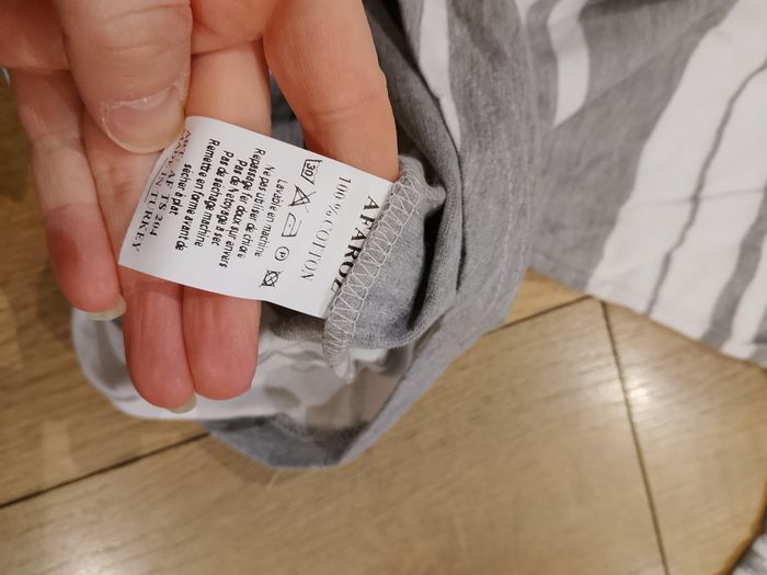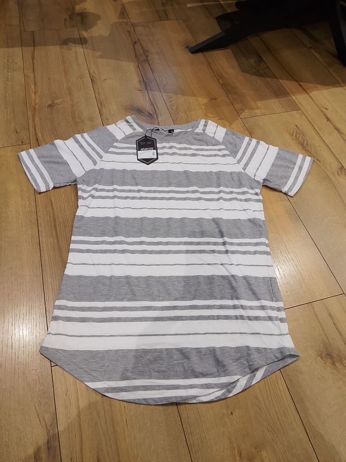 T-shirt gris et blanc pour homme, manches courtes, uni sur le devant et l'arrière. Coupe arrondie sur le bas. Ce modèle est fin. Taille : Étiqueté en XL. Marque : Afaroz Mesure dessous de bras à dessous de bras : 52 cm Article neuf avec étiquette. Vendu en magasin au prix de 19,99€. Afts204 gris XL N°1