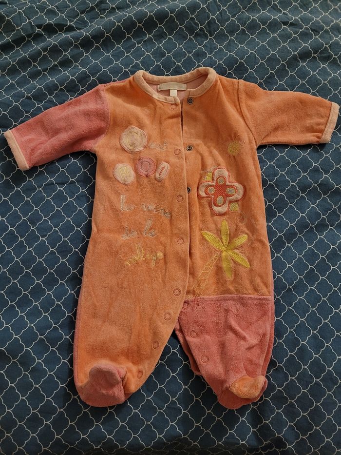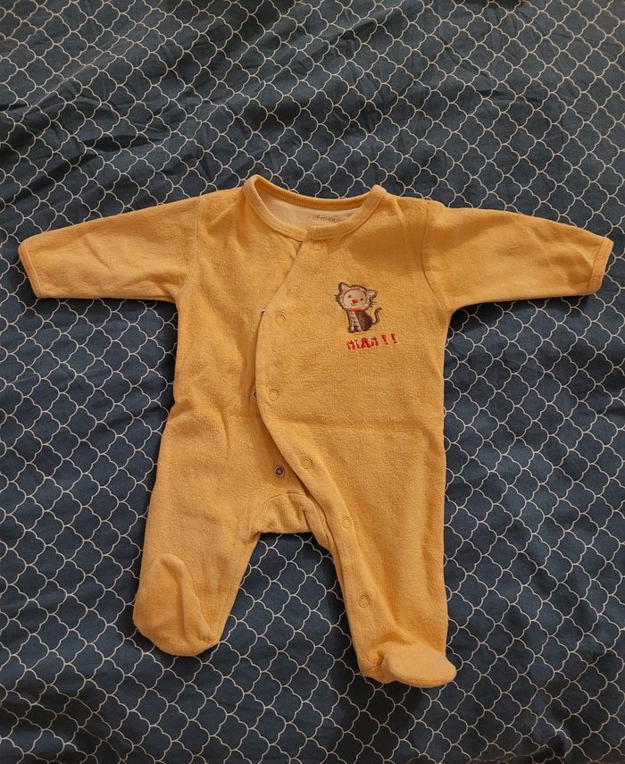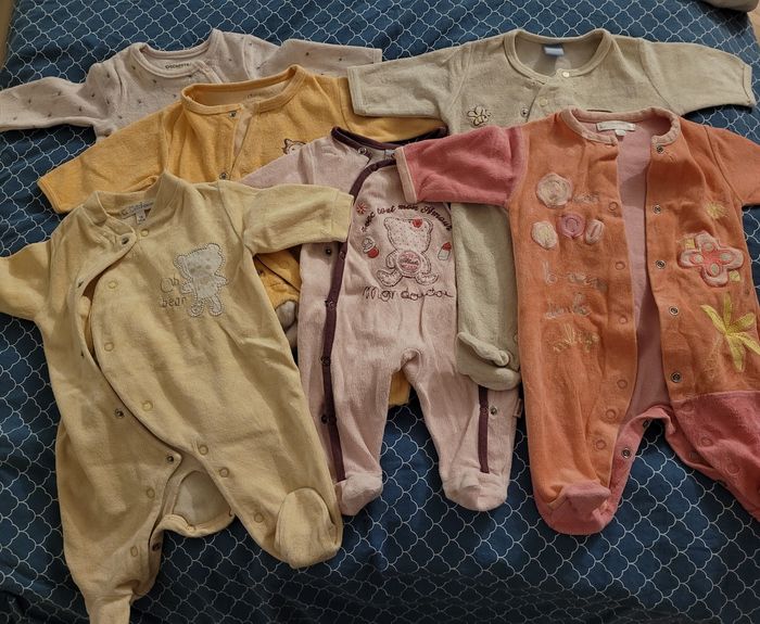 Lot de 6 pyjamas/grenouillères avec pressions sur l'avant. Marques: Orchestra, Les chatounets, Absorba, Kitchoun et Disney.