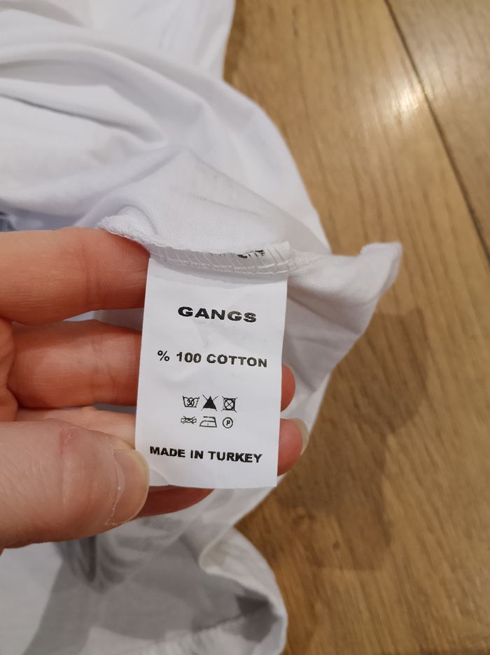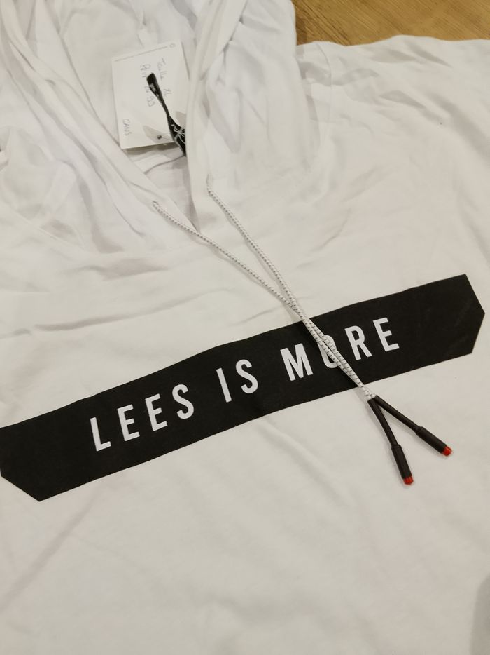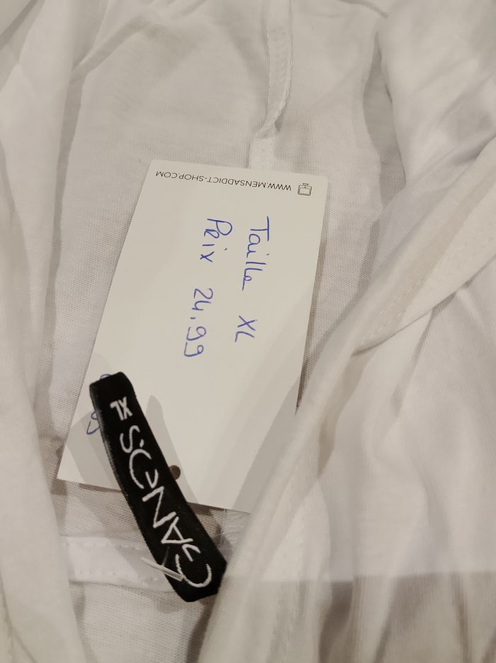 T-shirt rouge et blanc pour homme, manches courtes, avec capuche (elle ne se retire pas), motifs sur le devant et l'arrière. Coupe arrondie sur le bas. Ce modèle est fin et long. La première photo est l'arrière. Taille : Étiqueté en XL Marque : Gangs Mesure dessous de bras à dessous de bras : 55 cm Article neuf avec étiquette. Vendu en magasin au prix de 24,99€. 205 (20) noir XL N°1