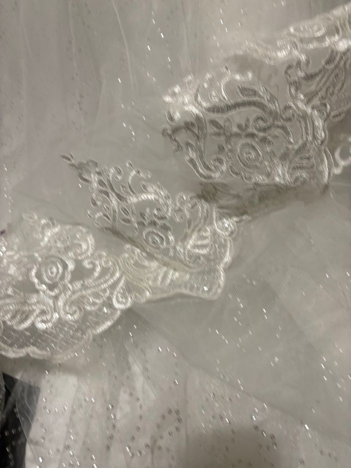 Magnifique robe de mariée style princesse, très élégante et romantique Portée uniquement pour essayage en excellent état, aucune tache, aucun défaut. * Détails : • Robe blanche avec dentelle florale sur le naut • Manches 3/4 transparentes en dentelle • Dos magnifique en V + laçage corset (ajustable) • Jupe volumineuse en tulle avec effet légèrement pailleté • Grande traîne avec bordure dentelle (superbe rendu) Taille : Il n'y a pas d'étiquette, mais la robe a été portée par ma fille : → 1m78 / 65 kg Convient selon moi à une taille estimée M / 38 (éventuellement 40 selon morphologie) grâce au laçage réglable.