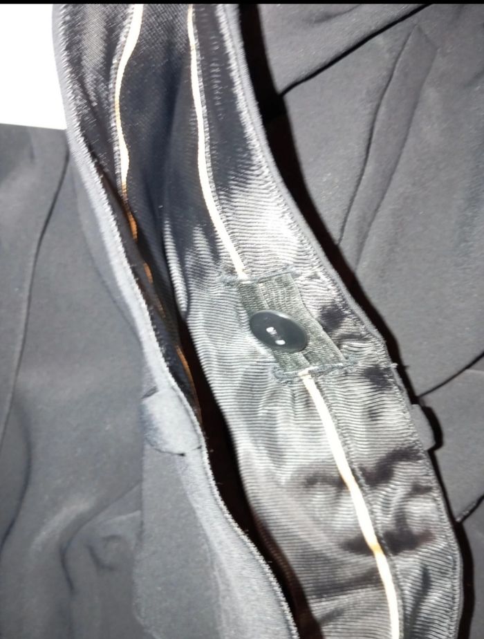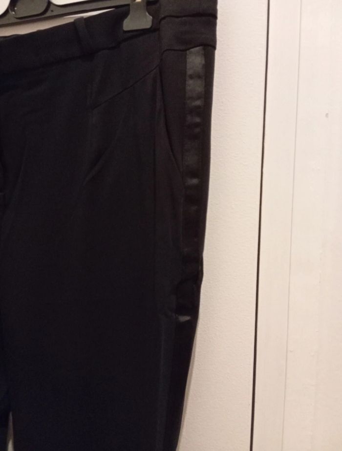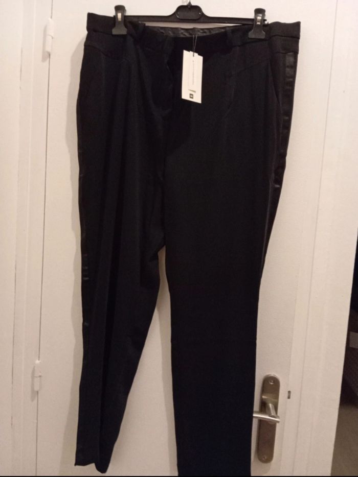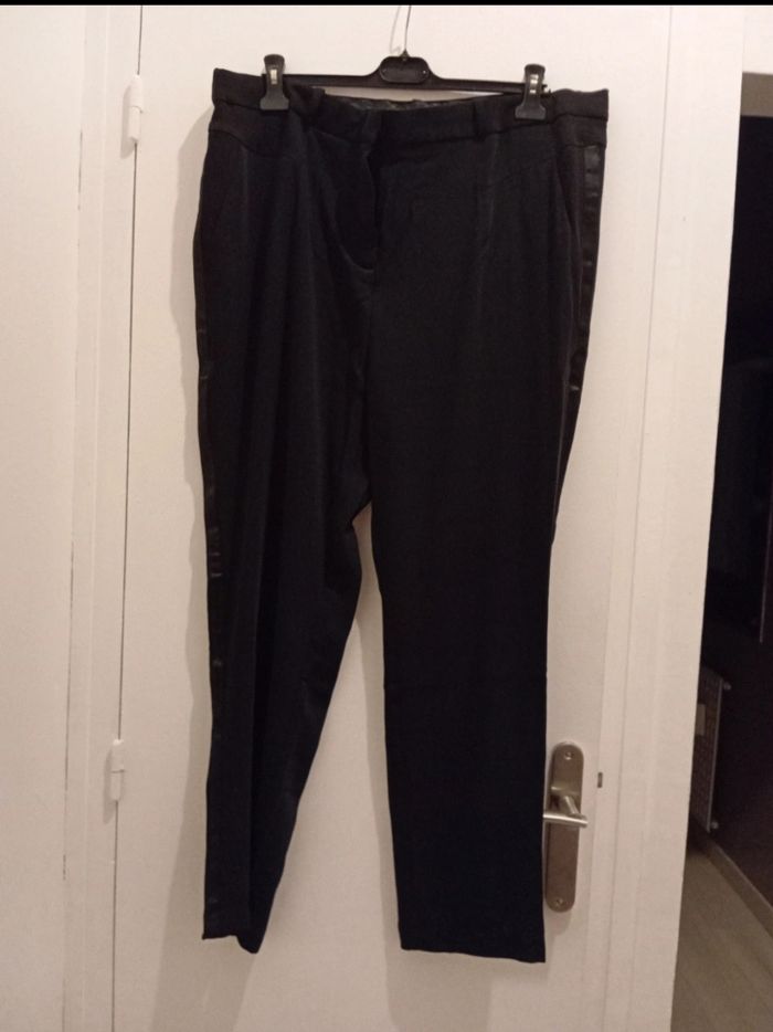 Pantalon noir, droit, Bandes satin sur les côtés, réglable par un lien élastique et boutons à la taille. Taille 46. Neuf