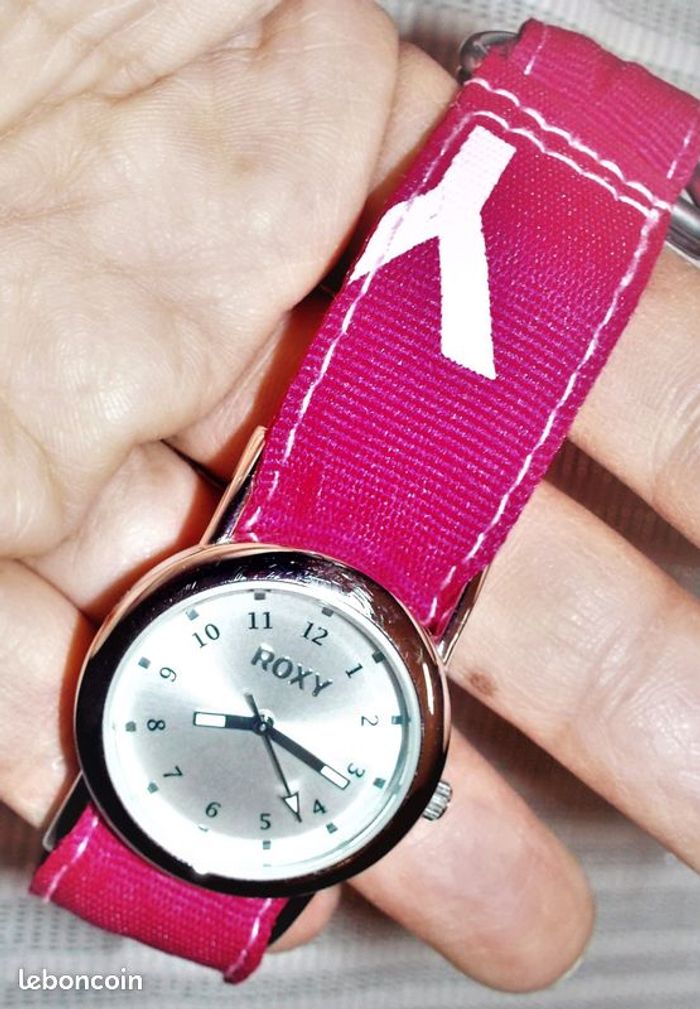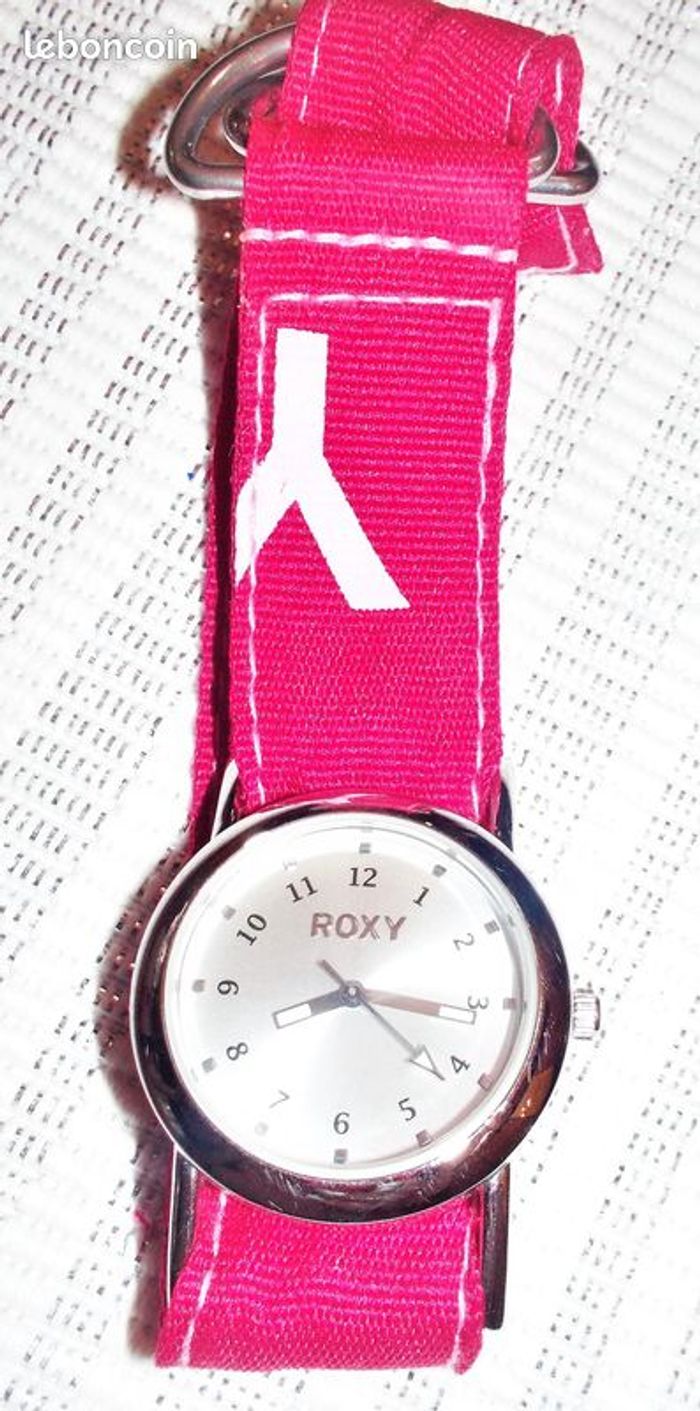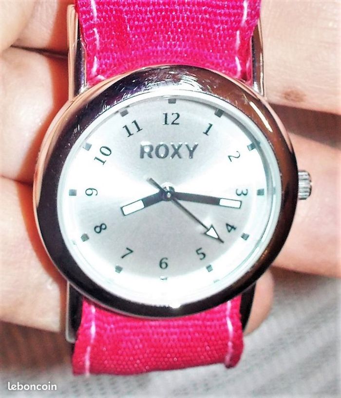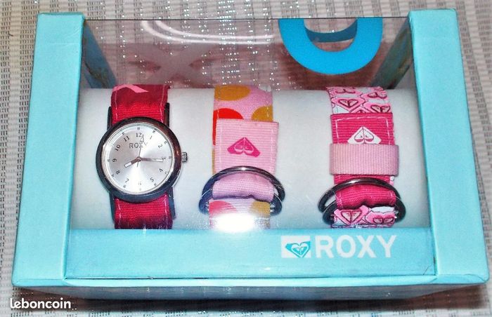 Montre ROXY "Flush", boîtier rond en métal argenté, intérieur blanc, chiffres et aiguilles argent, et 3 bracelets interchangeables, en tissu colorées à motifs, quasi neuve, en parfait état de fonctionnement, pile fourni, prix définitif.
