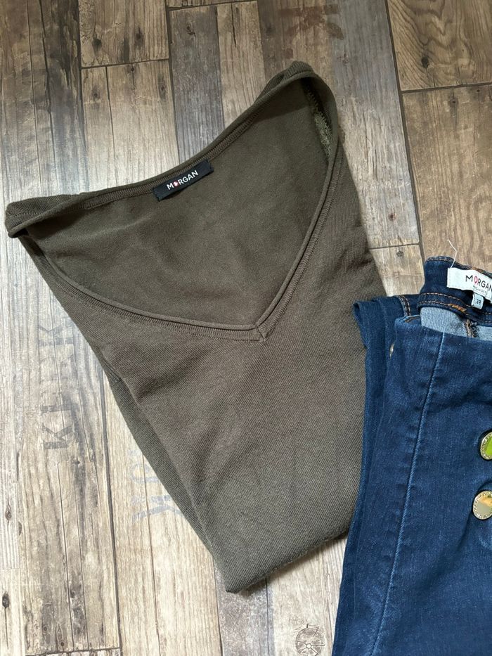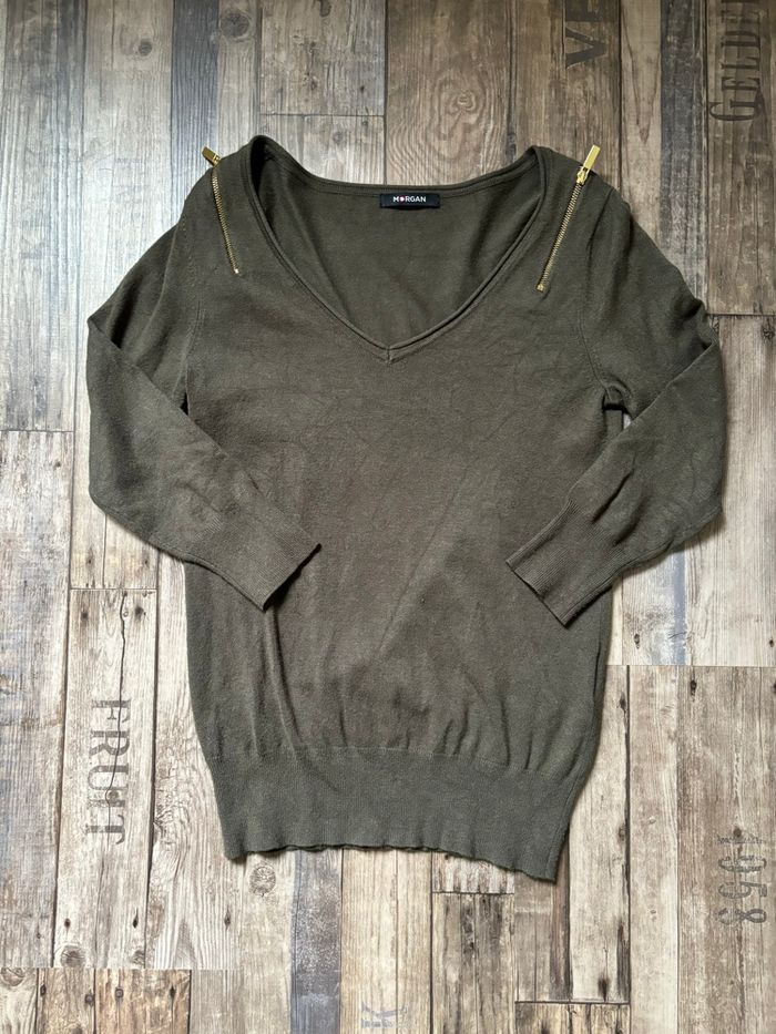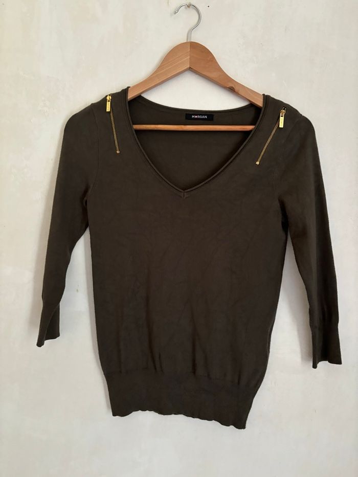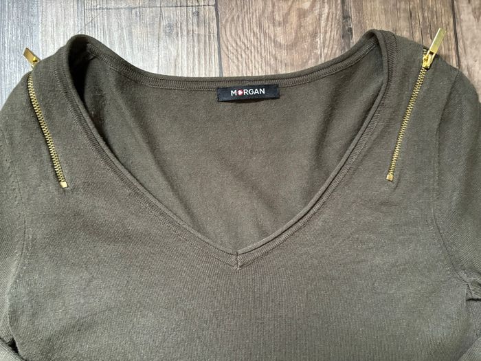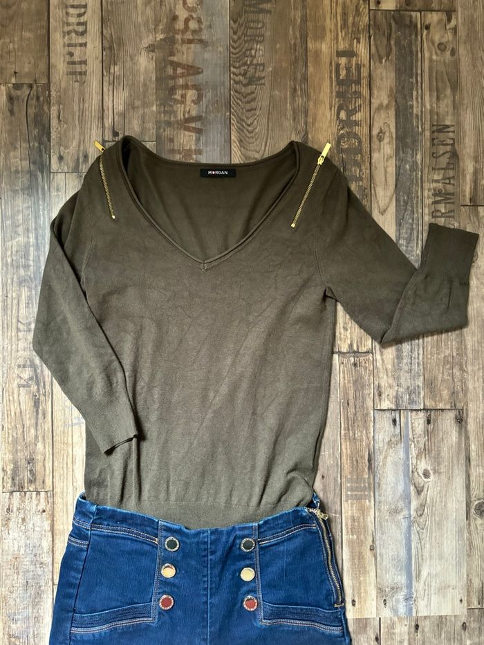 Pull Morgan Taille 34 Couleur kaki, col V et zips dorés sur les épaules Comme neuf, porté une seule fois ❄️🌸👌 N’hésitez pas si vous avez des questions 😉😊