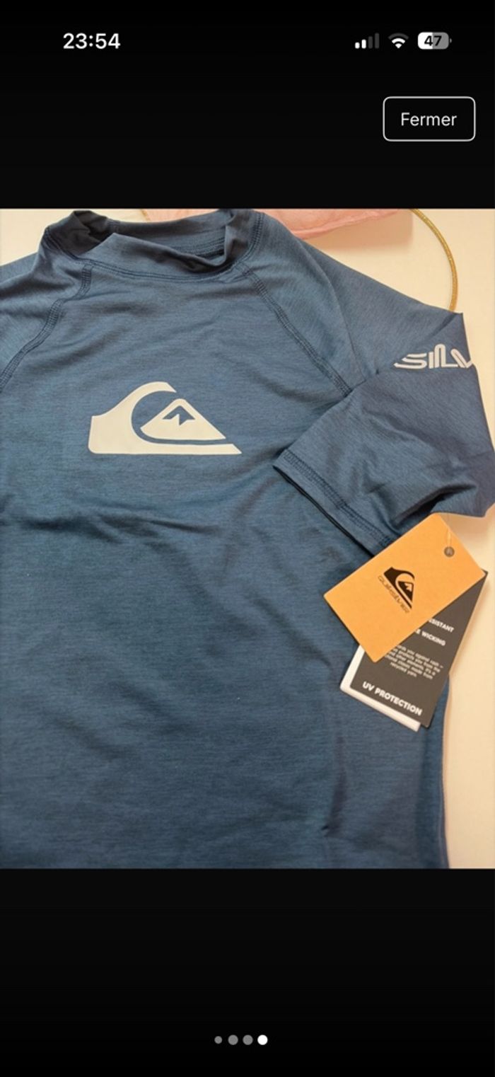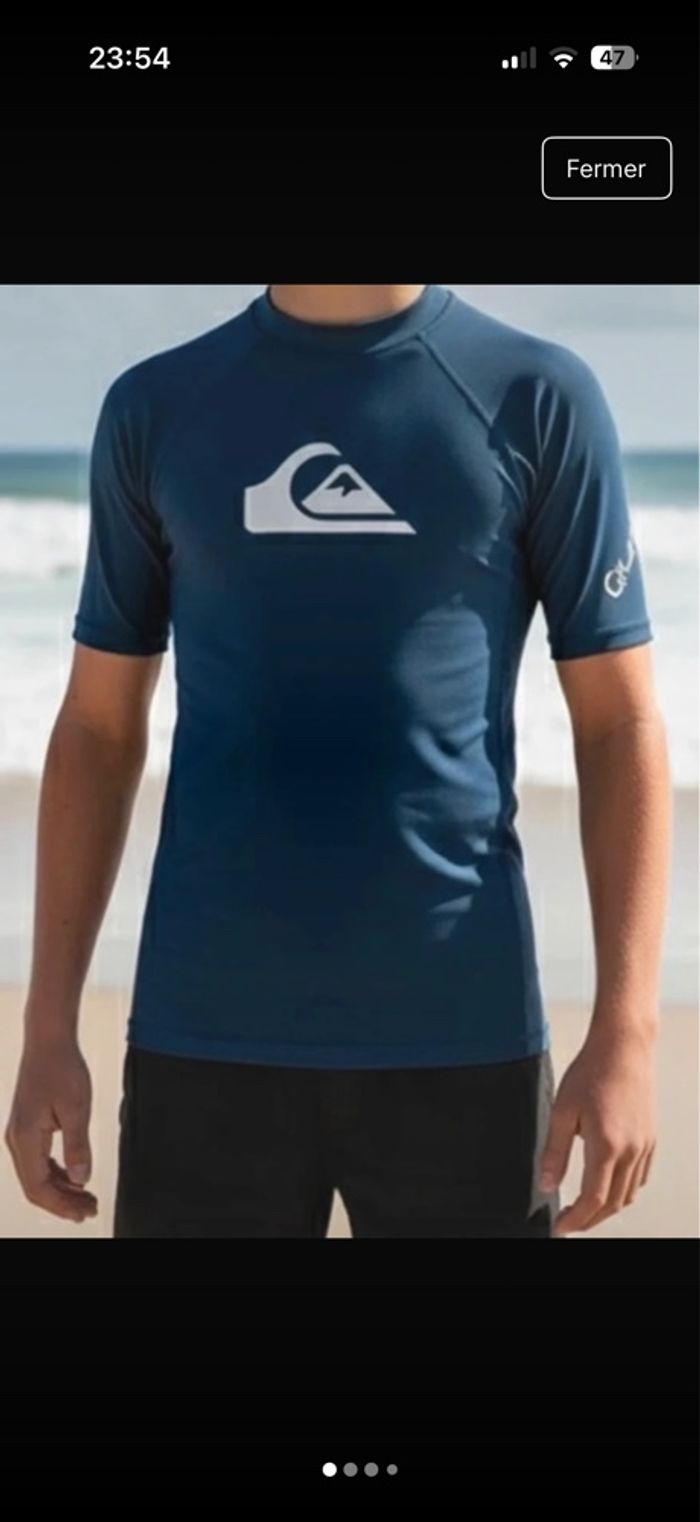 un haut de protection solaire (rashguard) à manches courtes de la marque Quiksilver, idéal pour protéger les enfants ou ados du soleil lors des activités nautiques. • État : Neuf avec étiquettes d'origine. • Couleur : Bleu marine • Protection : Certifié UPF 50+ (protection UV maximale) comme indiqué sur l'étiquette. • Détails : Logo Quiksilver noir sur la poitrine et marquage sur la manche gauche. • Propriétés : Résistant au chlore et conçu pour une utilisation prolongée dans l'eau. État: neuf avec étiquette Marque : Quiksilver Taille : 16 ans #ferreirasabboy16ans #quiksilver #lycra #uvprotection #upf50 #surf #baignade #neuf #bleu #piscine #ete