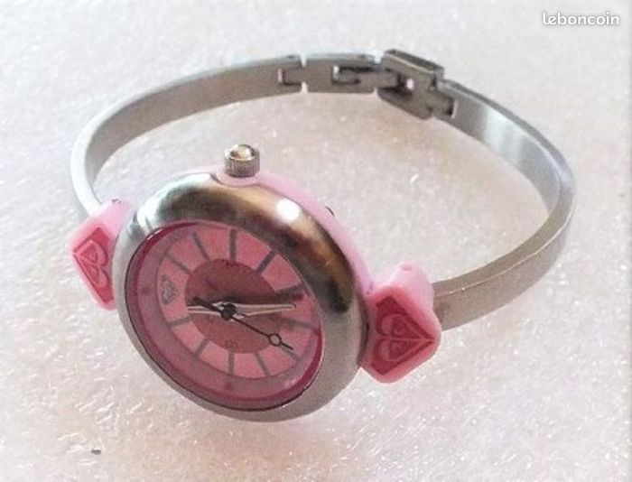 Montre ROXY "Pinkyness", boitier argent et rose de 25 mm, aiguilles blanc et noir et bracelet jonc en métal argenté, en parfait état de fonctionnement, pile fourni, prix définitif.