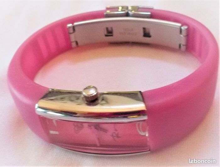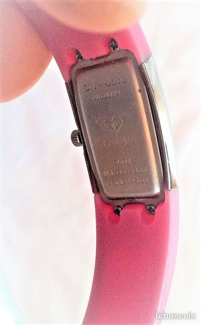 Montre ROXY "Sity Girl", boitier rectangulaire en acier argenté, intérieur rose, chiffres, aiguilles argent et trotteuse rose, et bracelet rigide en silicone rose assorti, en parfait état de fonctionnement, pile fourni, prix définitif.