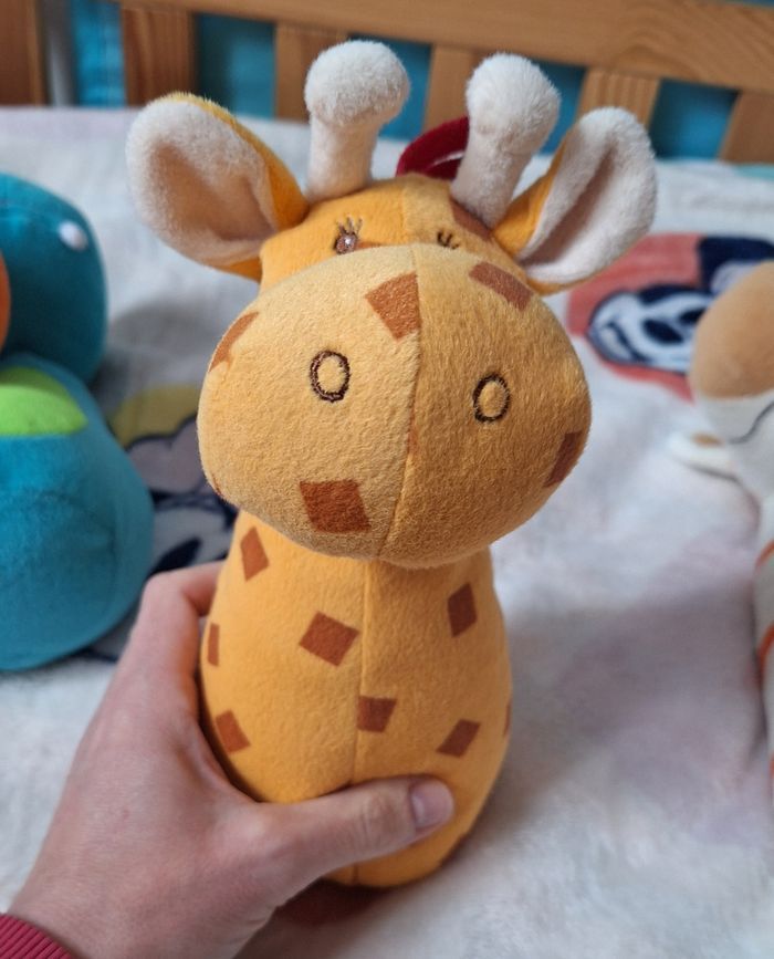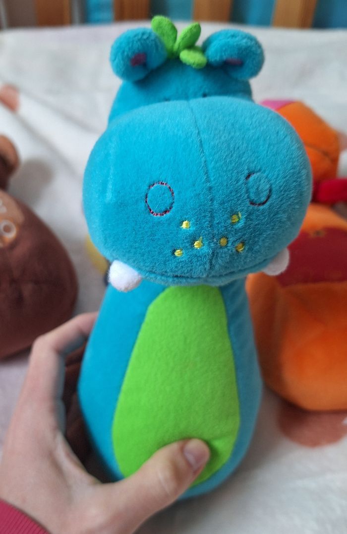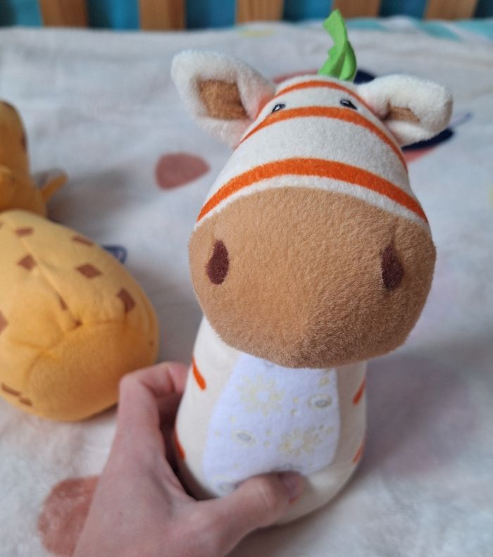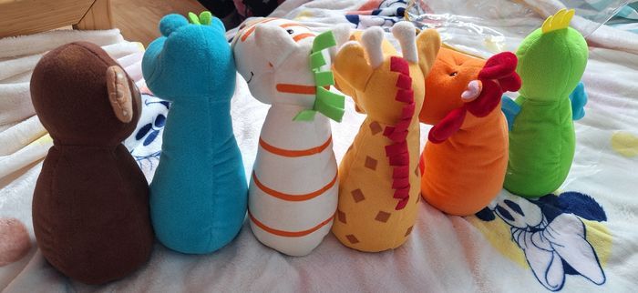 Ludique et rigolo ce jeu de 6 quilles Lilliputiens en tissu en forme de personnages animaux amusants Modèle safari animaux de la jungle Balle multicolore toute douce avec grelot intégré Idéal pour développer sa coordination et sa motricité fine durant une partie de bowling Vendu dans son sac de transport