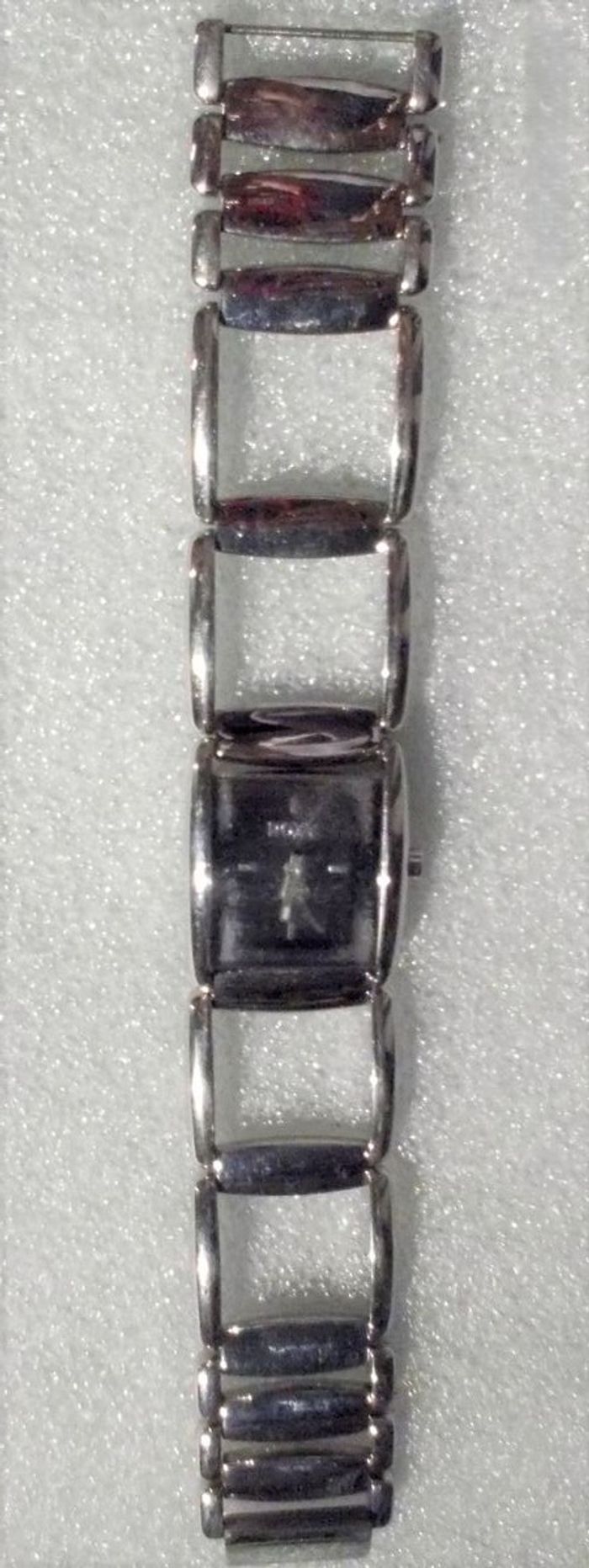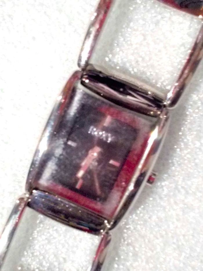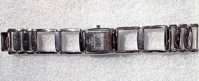Montre ROXY "The Coast", boîtier rectangulaire en acier argenté à intérieur noir (rayures d'usure, polissage à prévoir), chiffres, aiguilles et trotteuse argent et bracelet acier assorti, en parfait état de fonctionnement, pile non fourni.