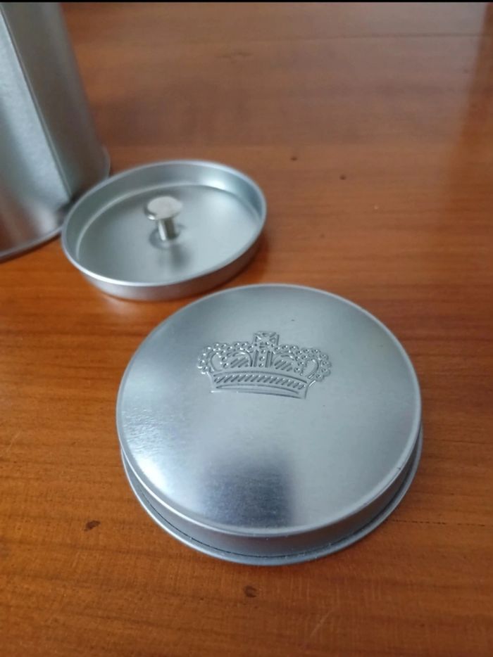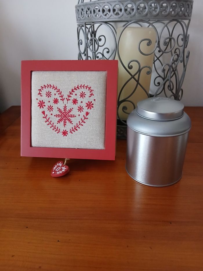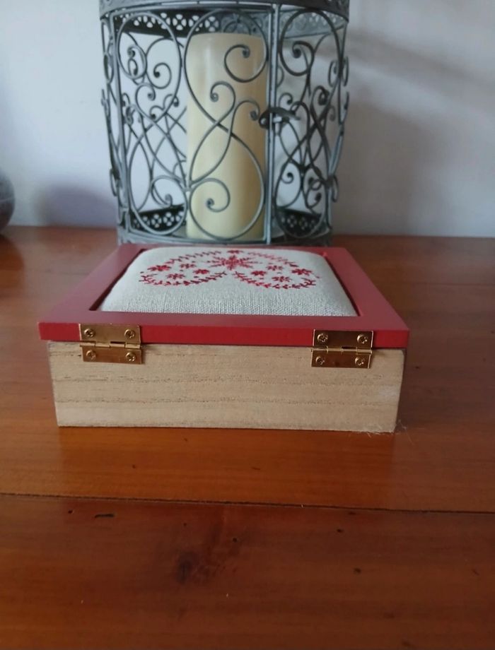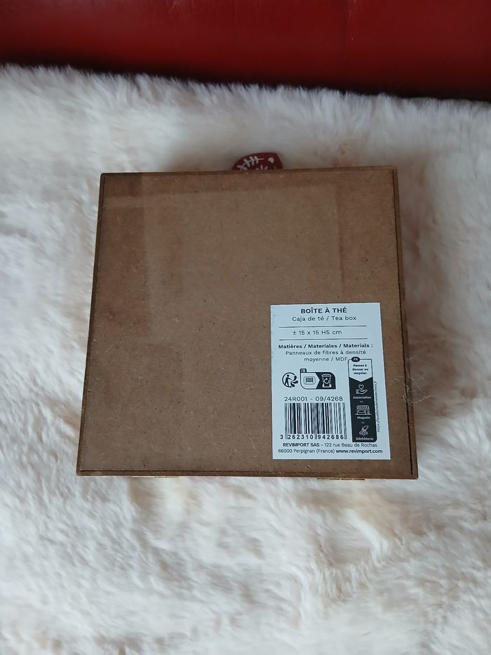 Articles neufs. 1/ Boîte en bois [ MDF] petit cœur en bois peint pour soulever le couvercle. Couvercle avec encadrure en bois peint; centre en toile brodée et rembourrée. 4 compartiments à l'intérieur : pour sachets de thé ou autre utilisation. Dimensions : 15 X 15 X 5cm. À Noter : le bois peut présenter différentes teintes; dûes à la découpe [ présentement dessous]Bien tenir compte de ce paramètre. 2/ Boîte à thé en métal argenté avec double couvercle : 1er couvercle avec motif " courone" gravé et second avec petite poignée. Hauteur totale de 11 cm ; diamètre du socle de 8,3 cm. À Noter : trace étiquette prix dessous [ se voit sur les photos ]