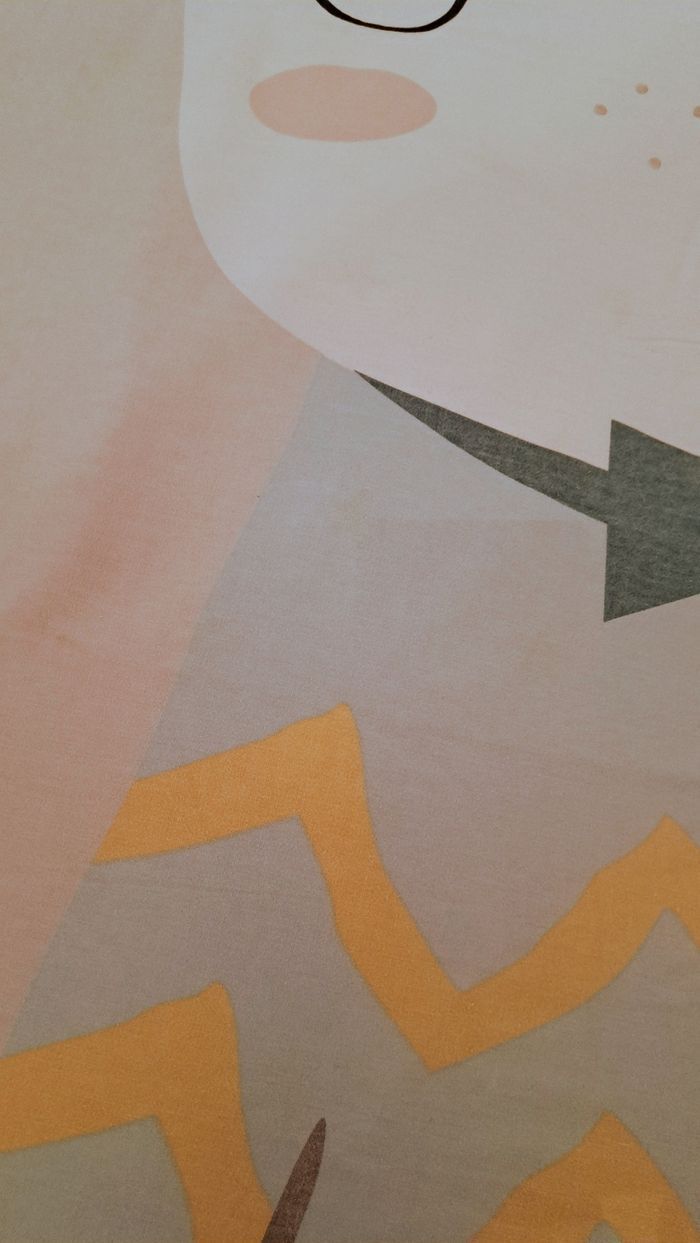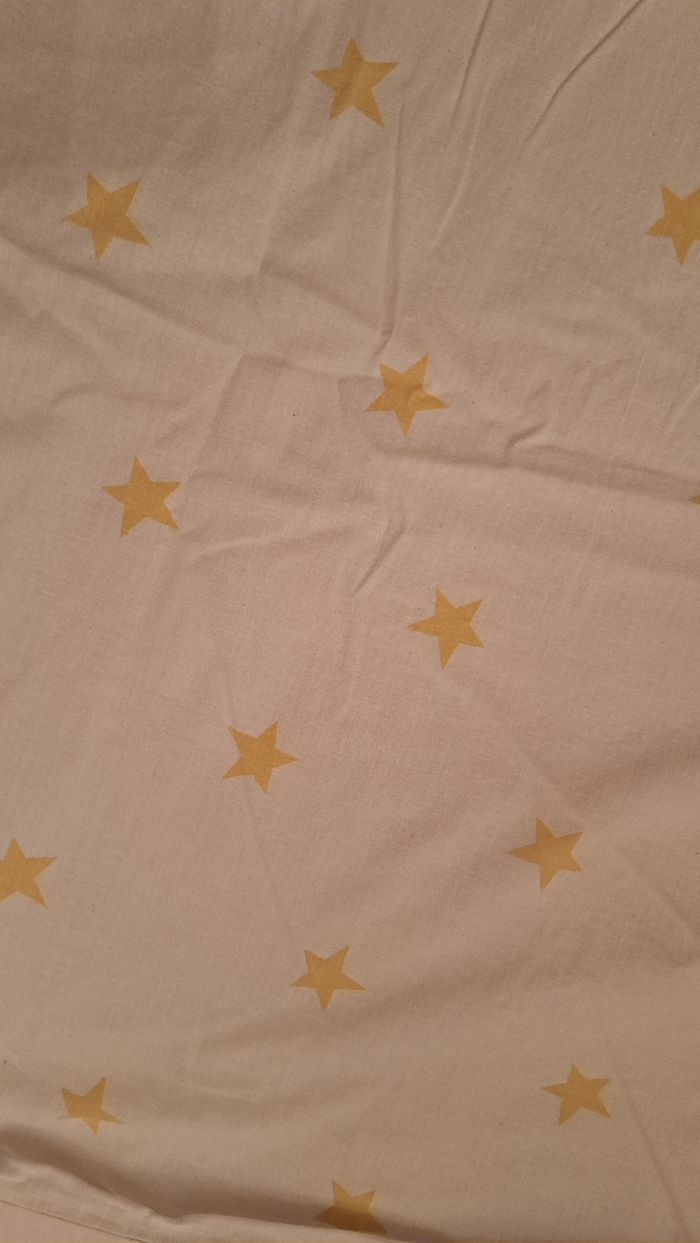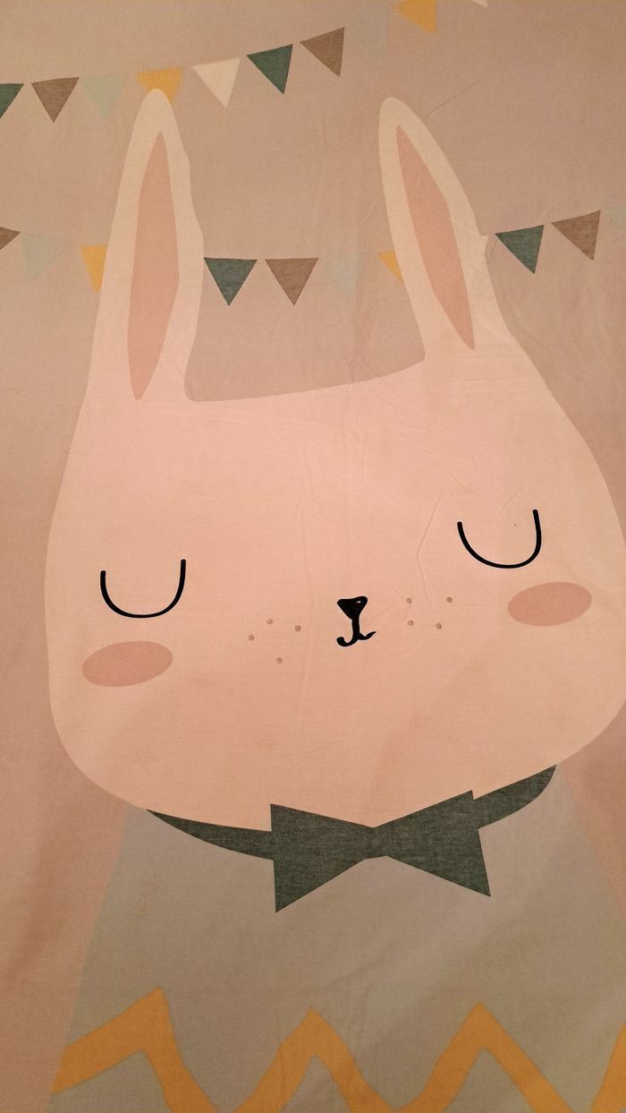Housse de couette. Jolie tête de lapin avec oreilles rose. Le reste est bleu, blanc, gris. Le recto est blanc avec étoiles doré. Dimension 90 x 200 cm